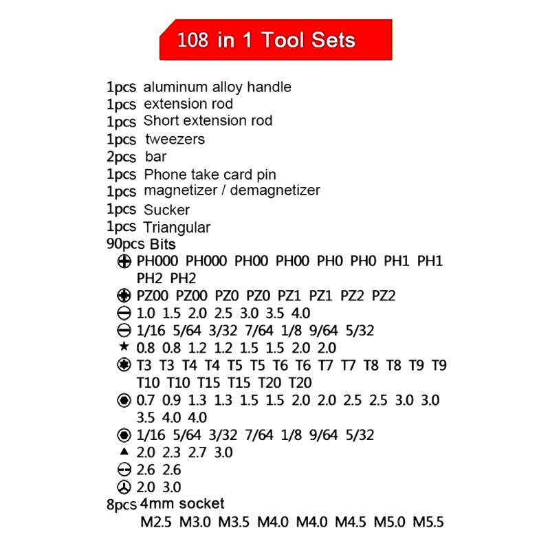 This professional 108-in-1 tool kit multi-function interchangeable precise manual tool set includes tweezers, a handle which is magnetic, an extension bar and 42 screwdriver bits. It’s lightweight, compact design ensures that you can use it at home and on-the-go! Comes with all the necessary tools for a wide variety of jobs. Perfect for repairing laptops, small appliances, mobile devices and other precision items, such as wristwatches and eyeglasses. Made of chrome vanadium alloy steel for longer life.