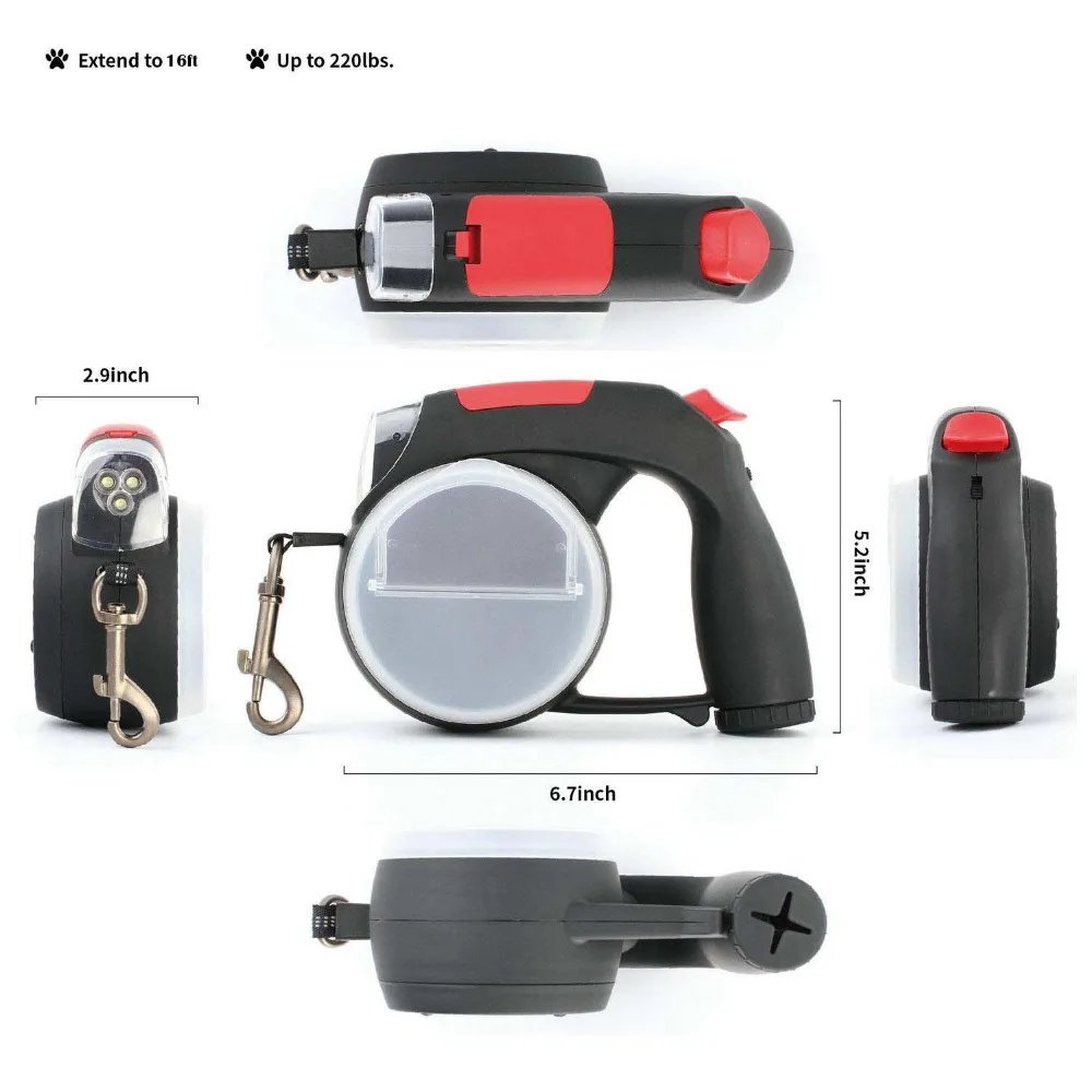 Waste bag dispenser, flashlight, treat container, collapsible water bowl and reflective lines are all included in heavy-duty dog leash retractable