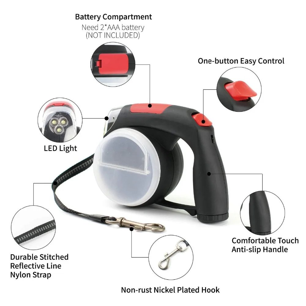 Made from durable plastic material, this 3 In 1 Retractable dog leash also includes three LED lights for added visibility during nighttime walks