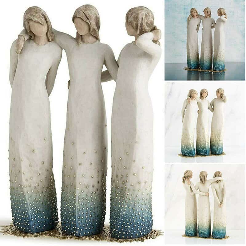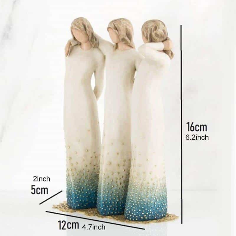 Are you looking for a gift to celebrate your deep feelings for your female friends, or your close sisters? We would like to introduce our 3 sisters figurines decorative which perfectly suits your requirements. The product is engraved with the shape of three girls standing next to each other, attached to the base of metal and gold leaf, it shows affection. The figures in cream dresses, with skirts embellished in blue ombré and gold-leaf dots at base. It is not only a souvenir but also can be used as a decoration for your room. This is a gift to celebrate supportive friendships among women, best friends, sisters, co-workers, neighbors. Order now!