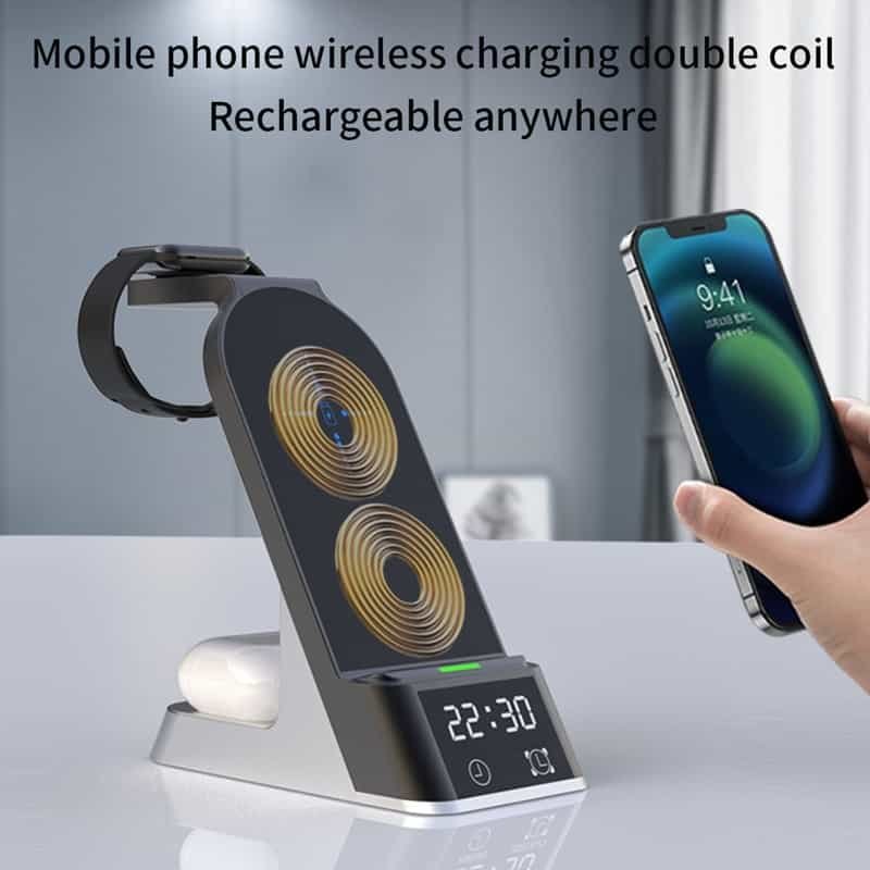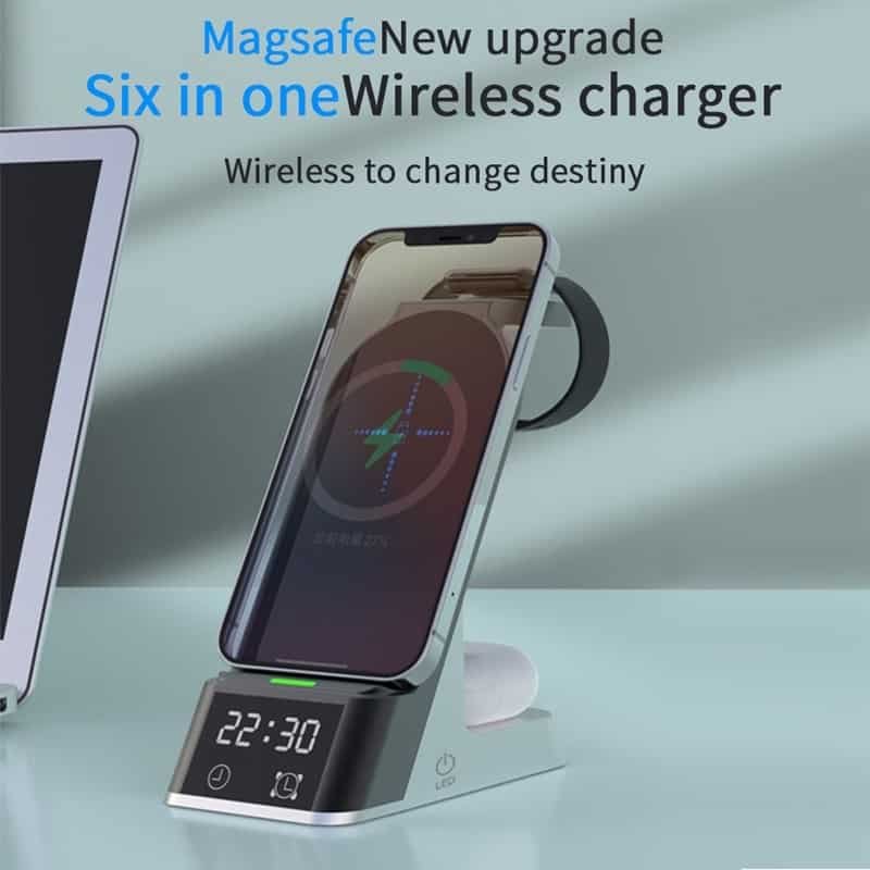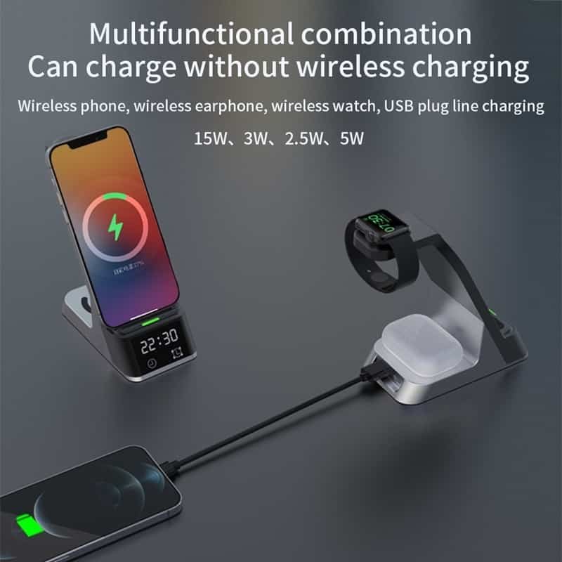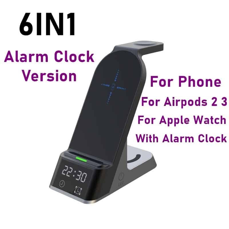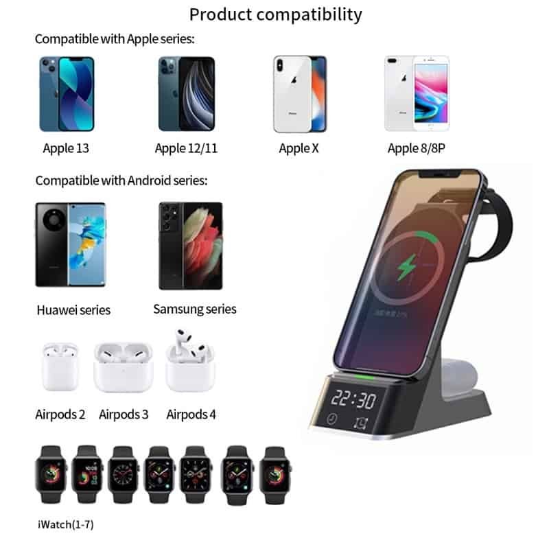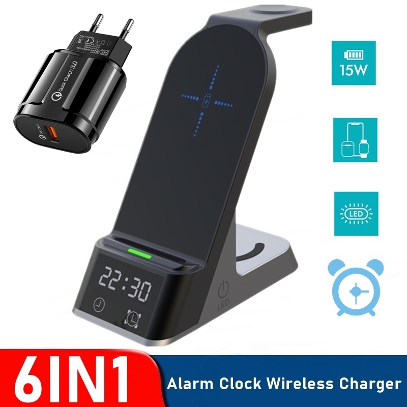 6 in 1 Wireless Charger: The wireless charger is specially designed for your Apple device (For iPhone/iWatch/Airpods) and is an excellent alternative to the charger of Apple products. The included 15W QC 3.0 adapter is required for the best charging experience. Two mobile phones, watches and headphones are charged at the same time, and the digital time display is displayed. At the same time, this wireless charger also has the functions of clock, alarm clock and LED light Universal compatibility: The wireless charger is widely compatible. The 15W fast charging mode is compatible with the for iPhone 12/12 Pro/12 Pro Max/SE 2020/11/11 Pro/11 Pro Max/XS/XS Max/XR/X/8/8 Plus/Apple Airpods 2, Airpods Pro, Airpods 3, 2.5W compatible with Apple Watch series 7, 6, 5, 4, 3, 2, 1, and most of the devices supported by Qi.