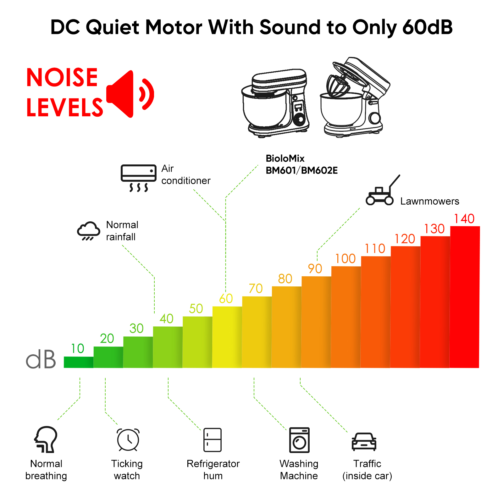 Quiet Operation: Enjoy a peaceful kitchen environment with a mixer that operates at a low noise level (≤60 dB).