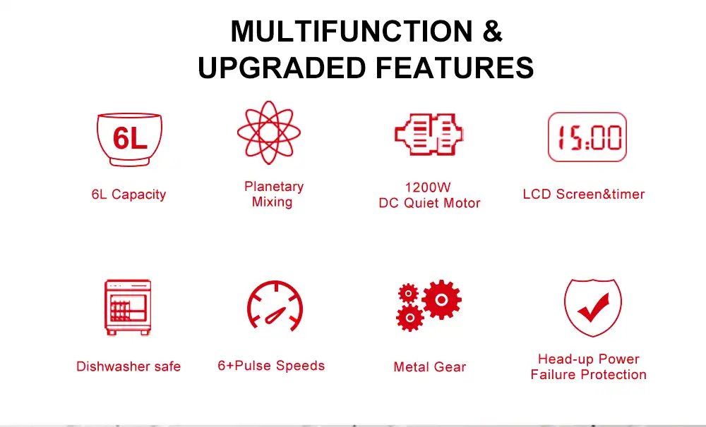 Large Capacity: The 6L bowl is perfect for preparing large quantities, saving time and effort in the kitchen.