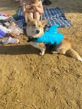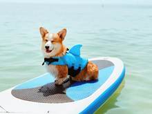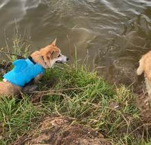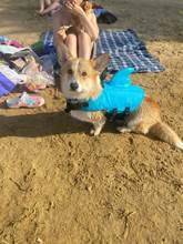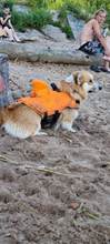 The dog is great. Swim is convenient, even in the sand lie comfortably). Size M on the corgi.