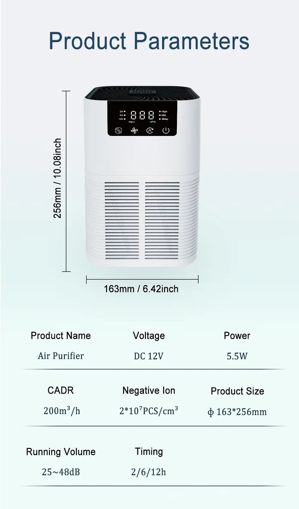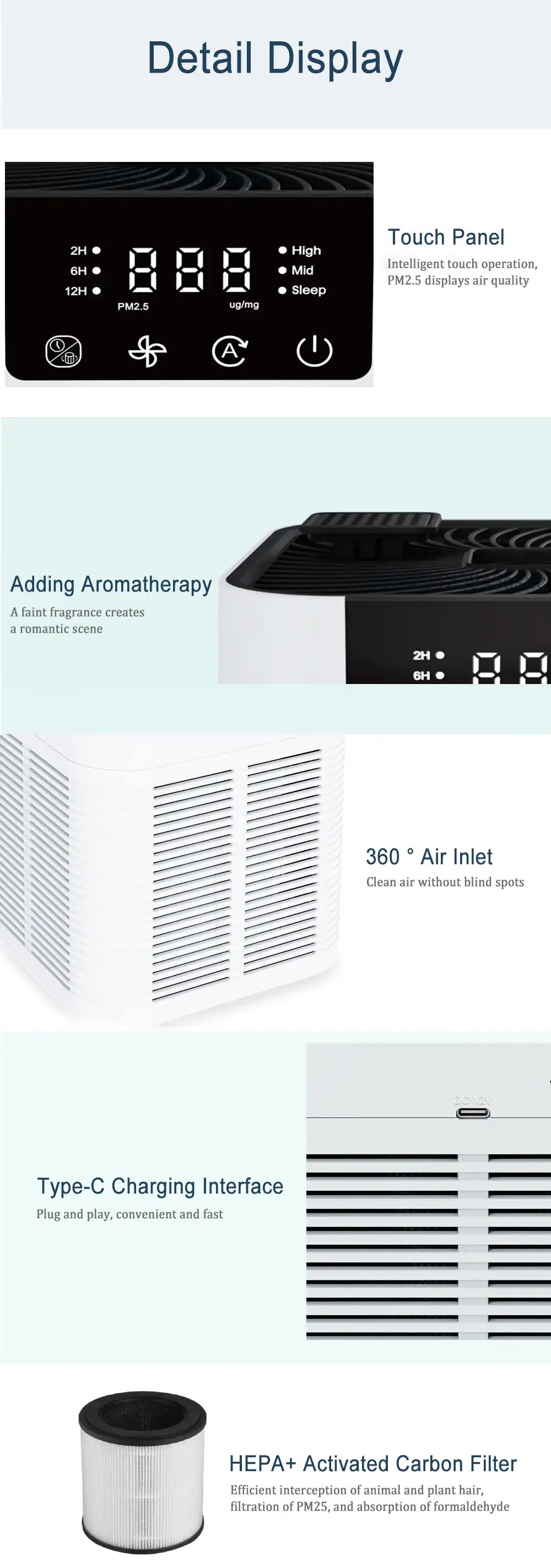 5. Main function: 3 speed wind speed purification air, PM2.5 can be filtered. HEPA filtration, silent operation, 360° three-dimensional surround air inlet.