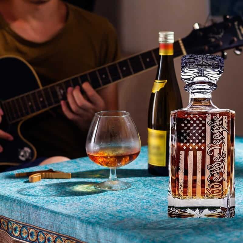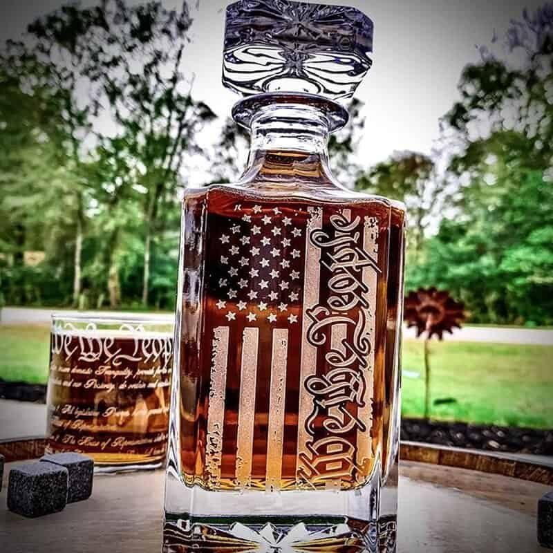 Patriotic Text Engraved: This eye-catching decanter is engraved with “We The People” and American Flag. This list applies to an engraved whiskey decanter only, package does not include the glasses.