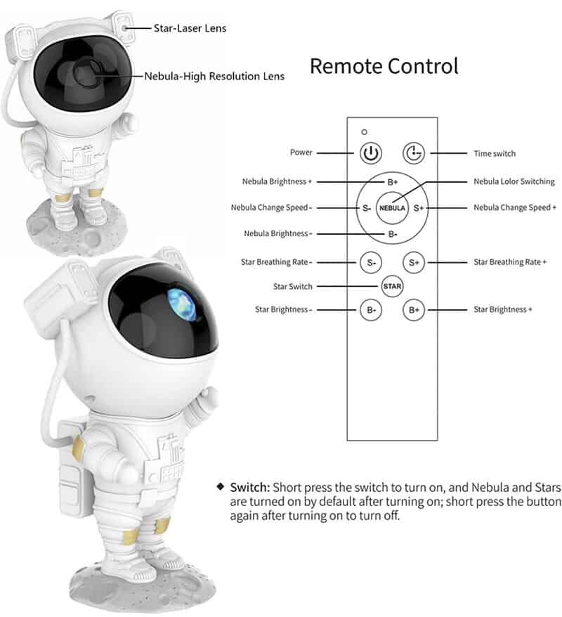 【Innovative Design And Unique Appearance】: The astronaut’s appearance design is novel and unique, echoing the starry sky and galaxy theme, and takes you to explore the vast starry sky. The astronaut’s head, which can be rotated 360° with magnetic attraction, allows the nebula to be projected anywhere without restriction. In addition, the astronaut’s lunar base is detachable, the arms can be moved, and various poses can be taken, which is also a good decorative ornament.