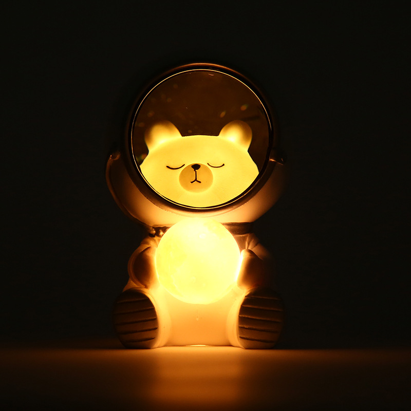 Features an adorable pet in a magnified helmet, holding a lit up moon