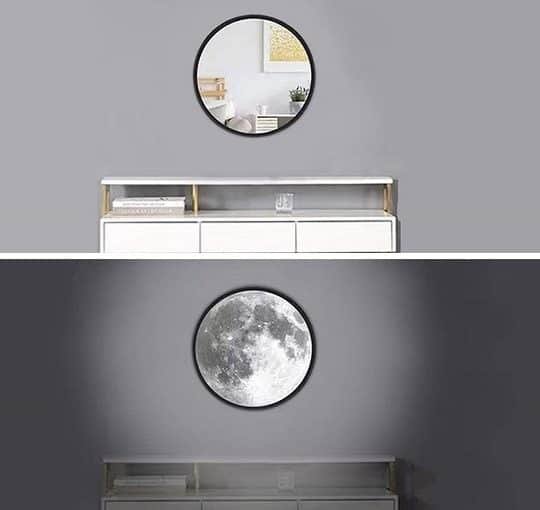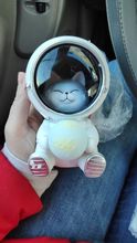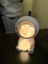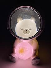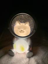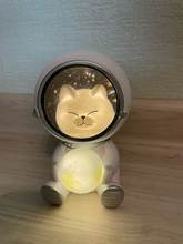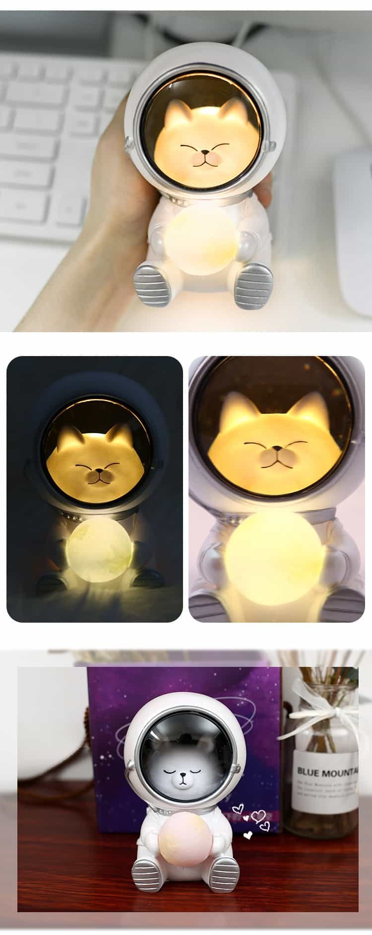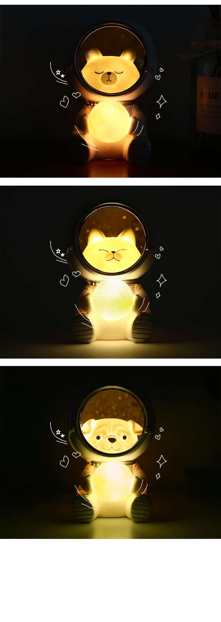 Features an adorable pet in a magnified helmet, holding a lit up moon