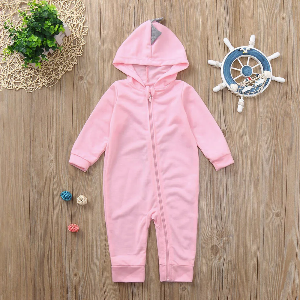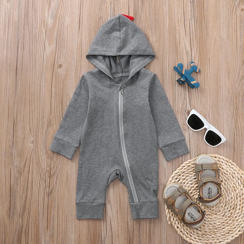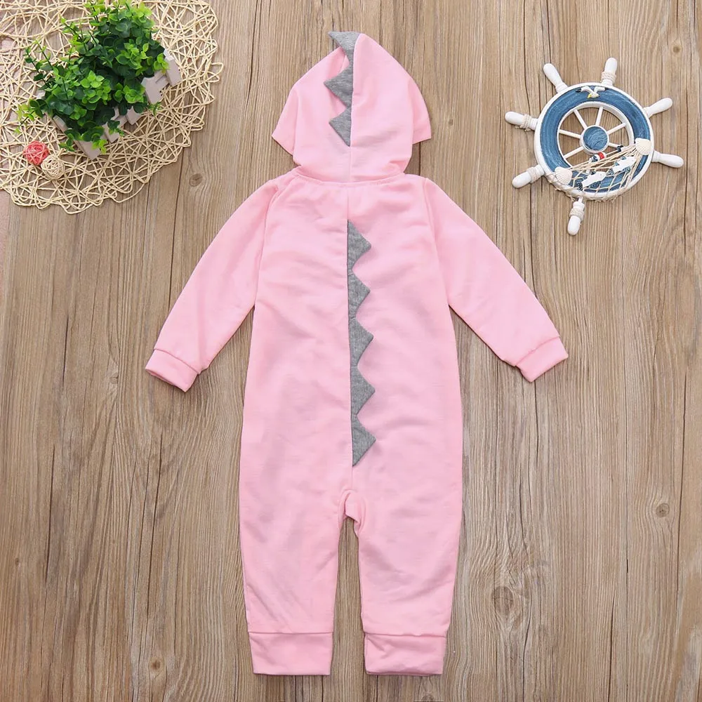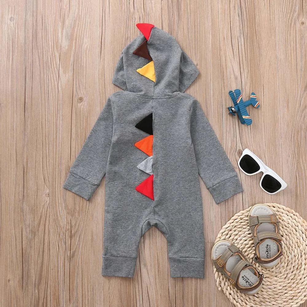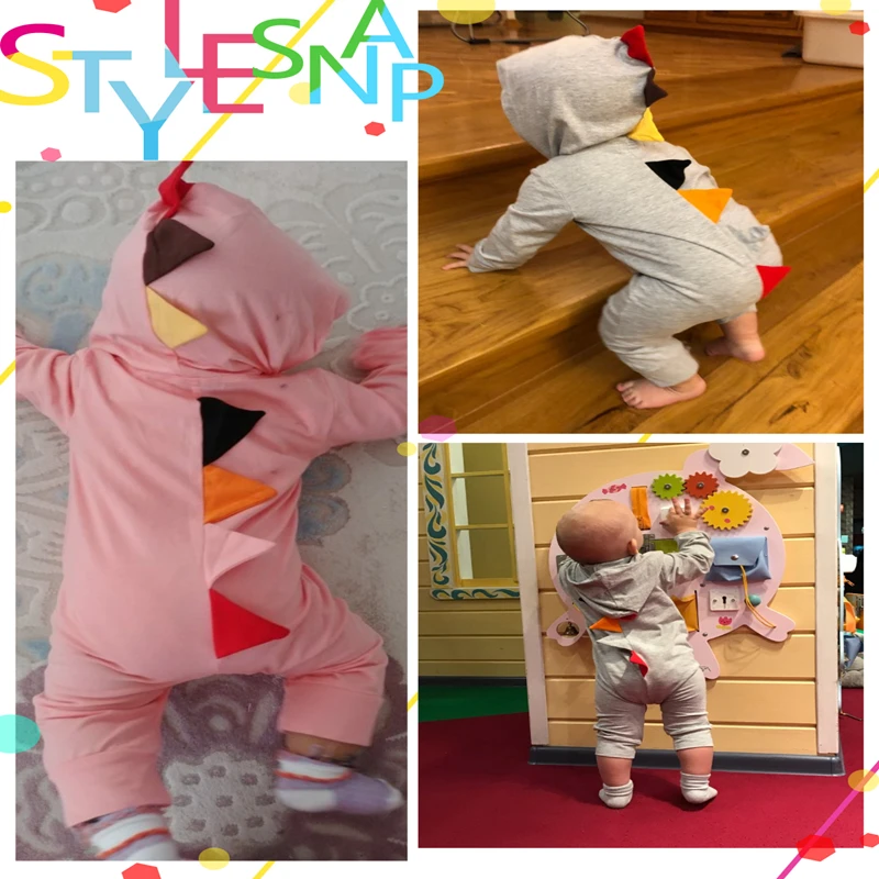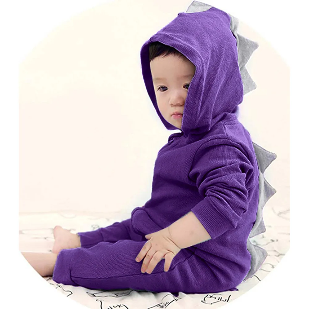Watch as your little one strikes a pose in this fun, yet comfortable baby dinosaur onesie hooded jumpsuit, perfect for photo shoots or everyday wear. This long-sleeved dinosaur jumpsuit for both boys and girls boasts a solid pattern and features soft cotton blend material to keep your child comfy. Dress up your little one up in this one-piece jumpsuit available in 0-18 month sizes, and enjoy the convenience of the machine-washable material.