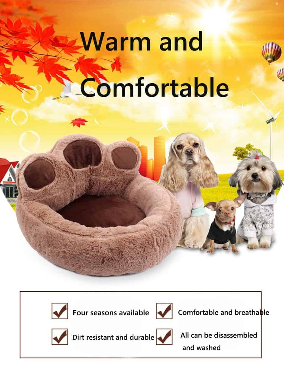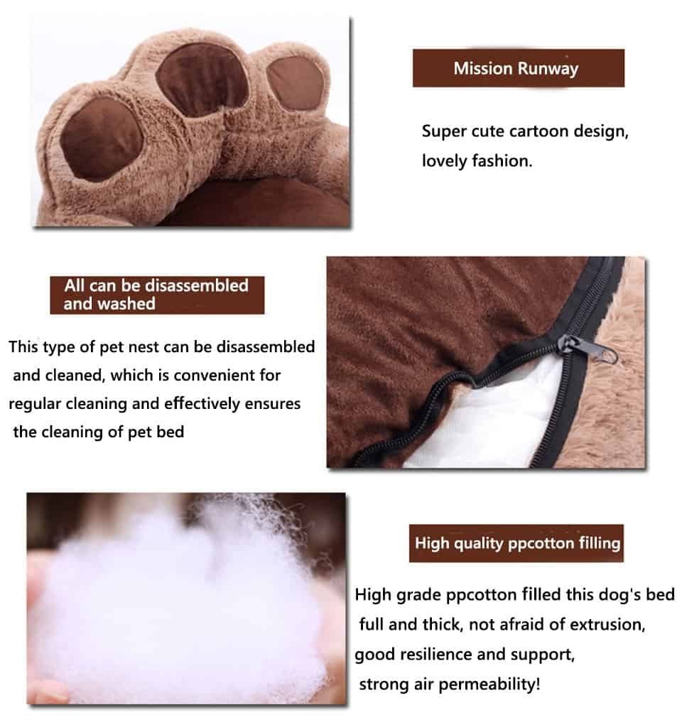 Are you looking for a comfortable bed for your puppy? Introducing to you our Bear paw dog bed, a soft pet bed specially designed for dogs! The shape of the bear’s paw has a more sense of design. Not only is it a pet bed when placed in the house, but it can also decorate the house and make the house look more comfortable and warmer. Super soft short pile dog bed accessories become skin-friendly and non-toxic, durable fabrics are not easy to break. The bottom and side pads have enough pp cotton, and the short plush can provide your dog with an ideal sleeping surface, keeping the dog bed warm and comfortable. Moisture-proof and waterproof design on the bottom, keeping you and your pets cleaner and more comfortable. This Bear paw dog mattress is perfect for any place like sofa, floor, high place, living room, porch, balcony, hallway, etc. Get it now!