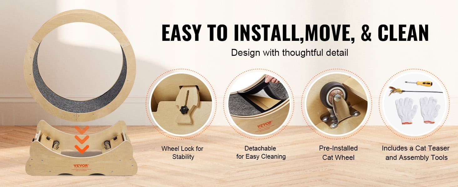 User-Friendly Design: Easy installation with pre-installed expansion screws and wheel, saving you valuable time. Included accessories like gloves, a screwdriver, and a cat teaser add extra convenience. This cat treadmill is a breeze to clean with a non-scratch detachable looped mat, easily spot-cleanable with a cloth or sponge.