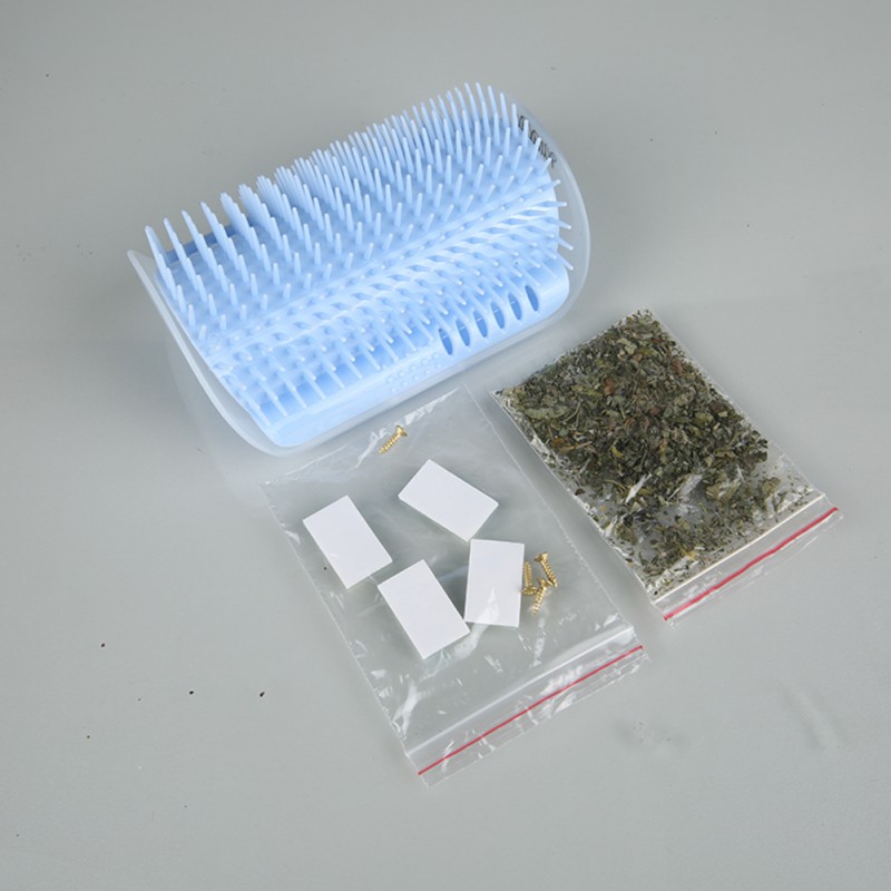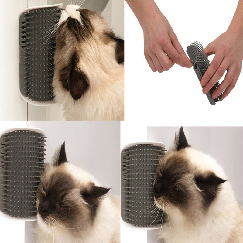Durable brush with a compartment for catnip, it can easily be mounted on either a flat wall or corner surfaces.