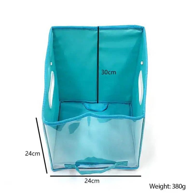 Foldable storage bin Unfold and clip to secure and fold down flat and detach when empty to store away easily. Easy space-saving design.