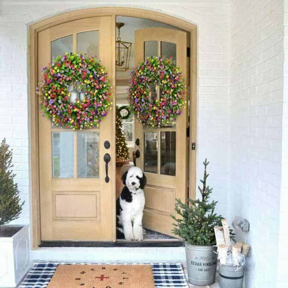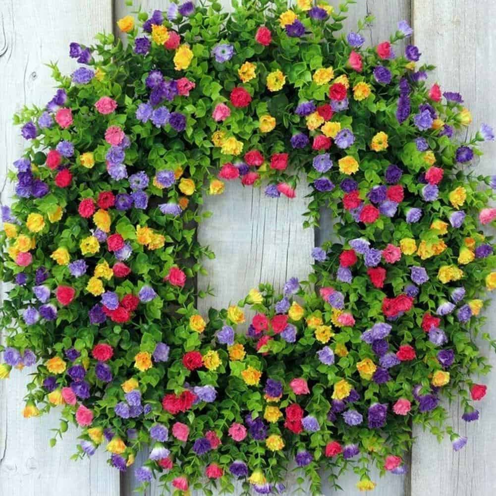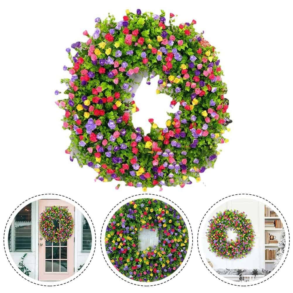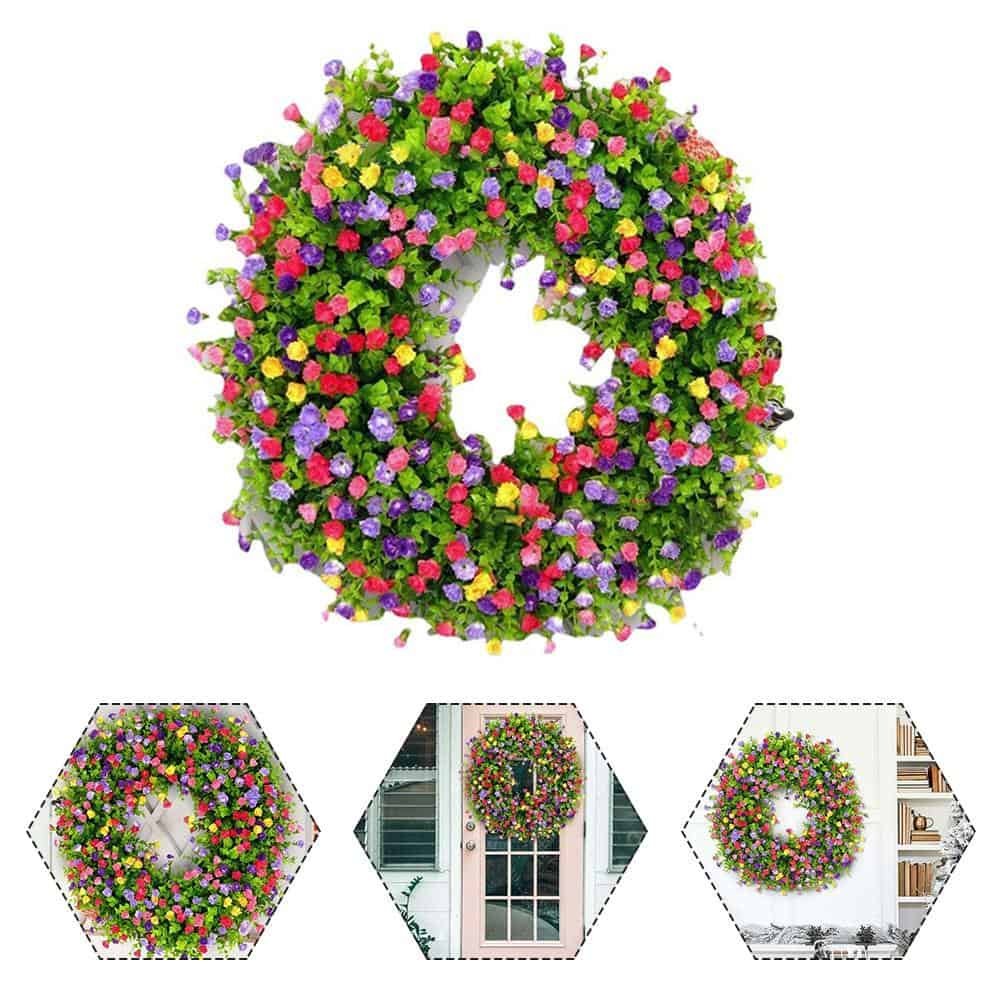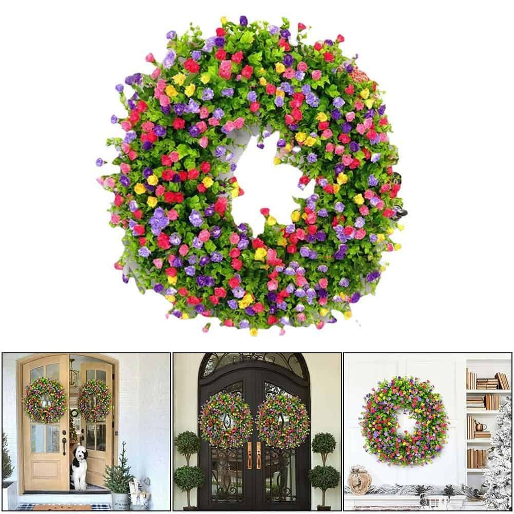 • This beautiful eye-catching wreath with pink, purple, and yellow buttercups, and a lot of eucalyptus greenery will look bright and lovely on your front door. This is such a lovely addition to my home. I love how it makes my front entryway so spring like and welcoming! For the cookie-cutter garland, this is a novel feature.