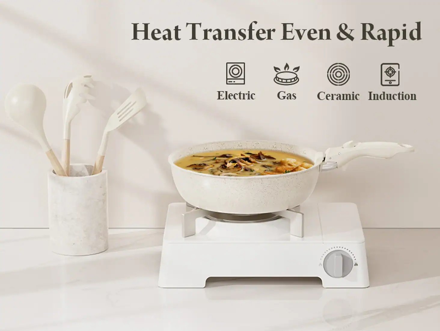 1. Sturdy European Standard Aluminum Alloy Body: The reinforced die-cast aluminum construction of cookware set ensures durability and reliability for long-term use while still maintaining a lightweight design.