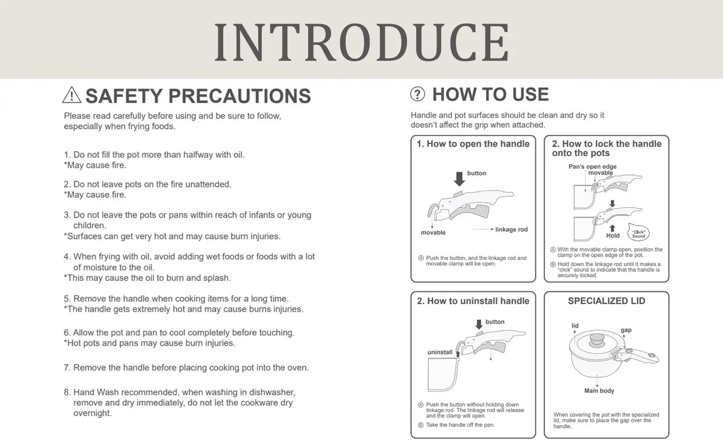 3. Convenience: The ease of attaching and detaching the handles makes cooking and cleaning more convenient. You can quickly switch between different cooking methods and easily fit the cookware into the dishwasher for cleaning.