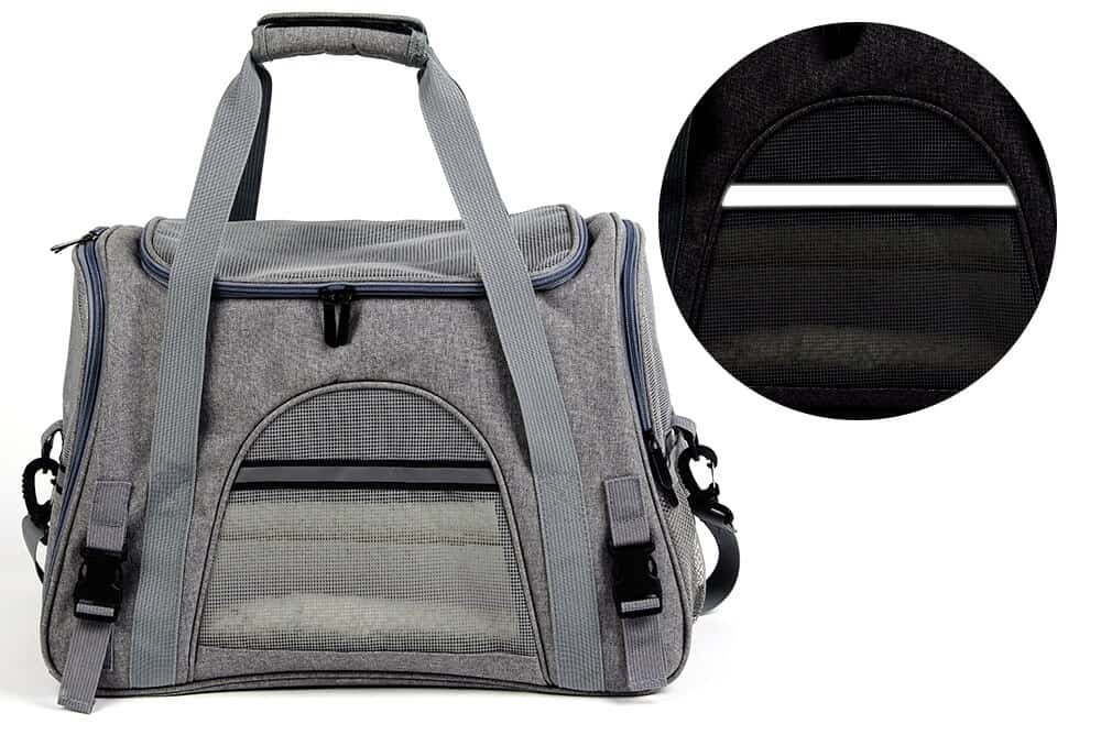 Silver reflective strips on the three sides of our cat carriers provide much personality and safety for your trips in the evening.