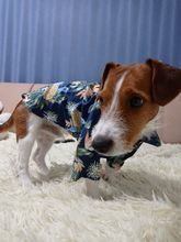 This collared shirt with tailored sleeves has a vintage style print featuring surfboards and palm trees. Thanks to the 100% cotton lightweight material, this breezy woven cotton shirt will keep your pup feeling and looking cool during walks on the beach, at pool parties, and on vacation.