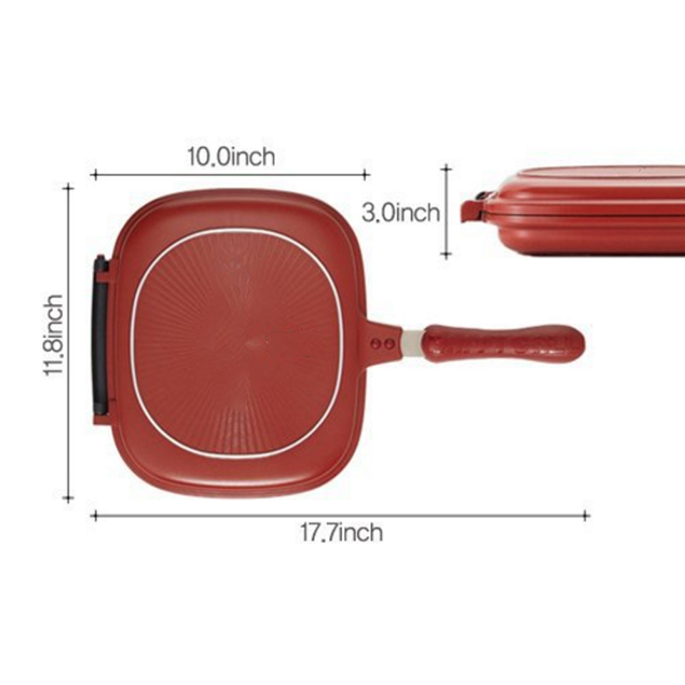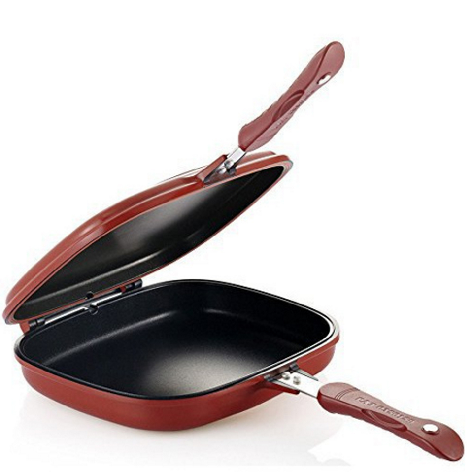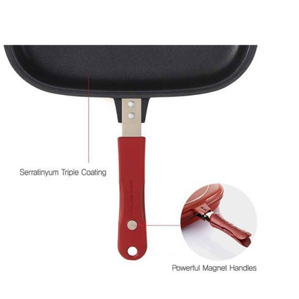 Discover a new way to cook with this versatile and innovative Double Sided Grill Pan. Experience superior cooking of almost all types of food. You can fry, grill, roast, bake and steam in it. This truly is a “Magic Pan”, allowing you to cook all types of meat, seafood and vegetables with less fuss, smell and mess. Cooking is healthier, as the triple-layered titanium-infused non-stick coated surface requires less fat, while the design of the pan locks in more flavour and nutrients. Smells are reduced and you get less splattered oil. When one side is cooked, simply flip the pan over! The lid locks into place with an innovative magnetic handle-based design and silicone piping inside the pan ensure a strong air seal to keep in moisture, flavour, steam, smoke and smell. A specially designed reservoir catches all liquid that might drip down the pan when the lid is opened. The hard anodised enamel coated scratch-resistant body makes this a pleasure to use. Your cooking will be easier and taste better than ever before.
