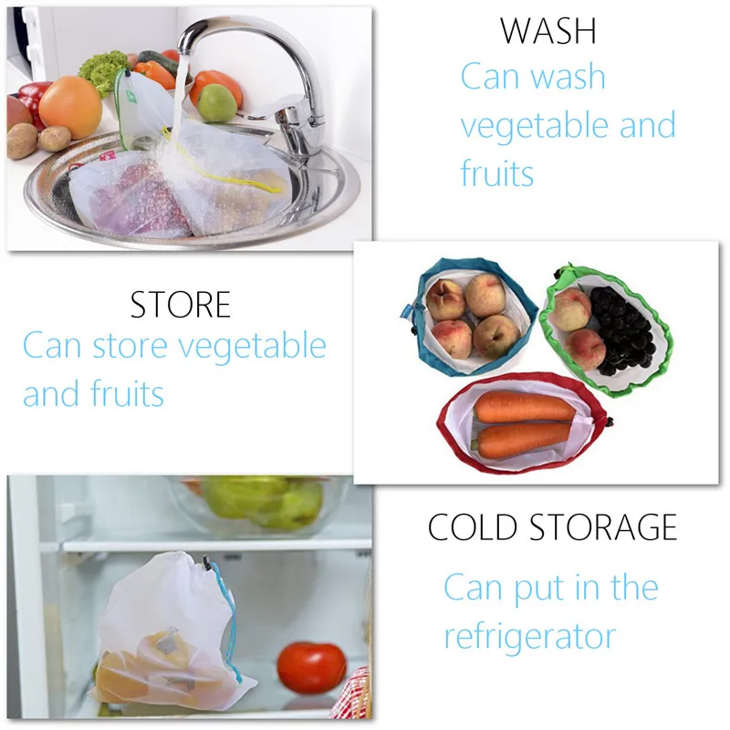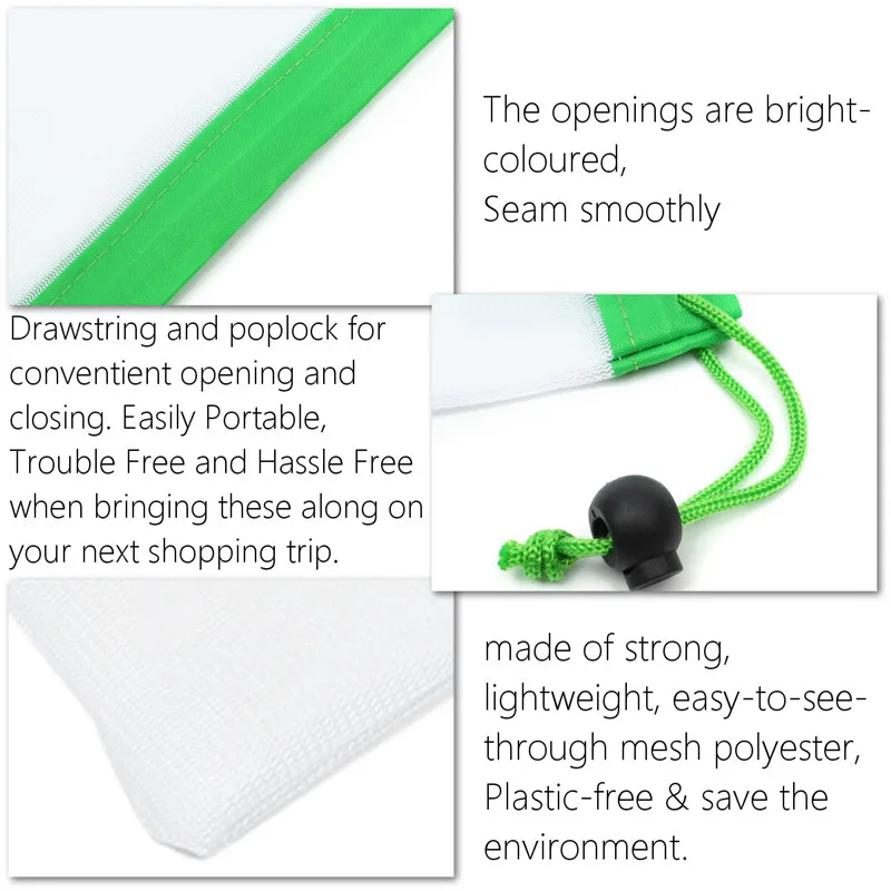 CONVENIENCE: Drawstring and pop lock for convenient opening and closing. Easily Portable, Trouble Free and Hassle Free when bringing these along on your next shopping trip. you can wash the produce directly in these bags and then place them straight into the fridge, less food wasted and great for the environment.