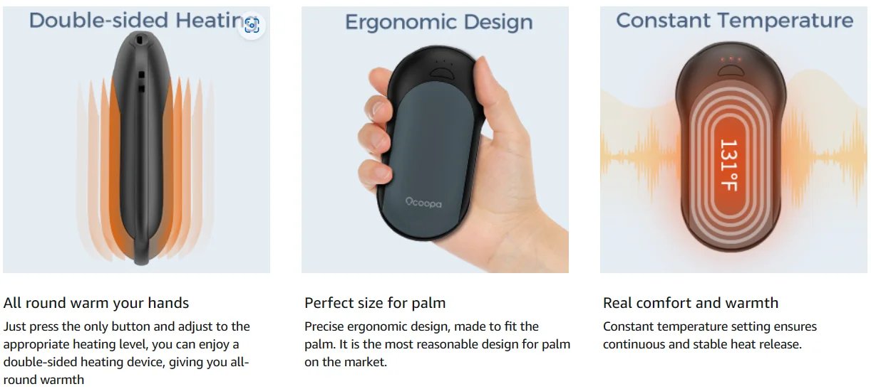 • Equipped with dual-sided heating elements, the Electric Hand Warmer provides consistent warmth to both sides of your hands.