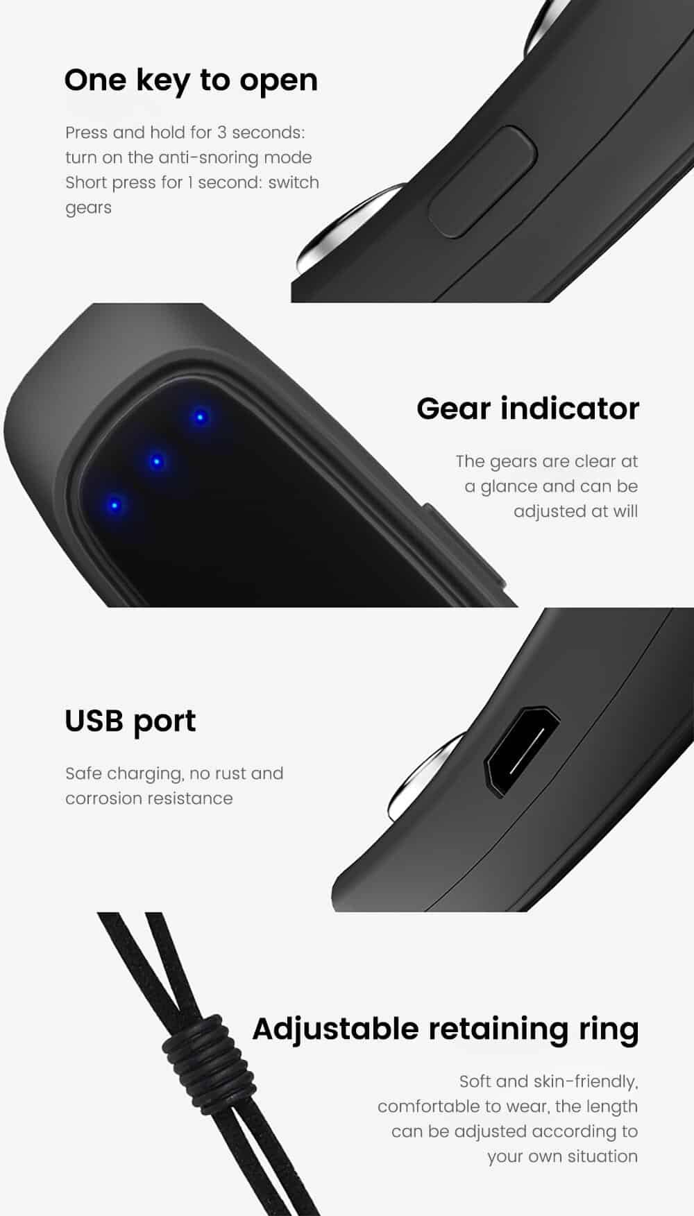 Wear the product during rest, the product will automatically and accurately detect snoring through high-precision sensors, massage the hypoglossal nerve and mandibular muscles through vibration pulses of different frequencies, promote muscle tightening, adjust breathing rhythm, and make breathing easier