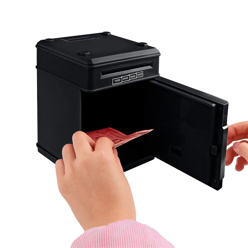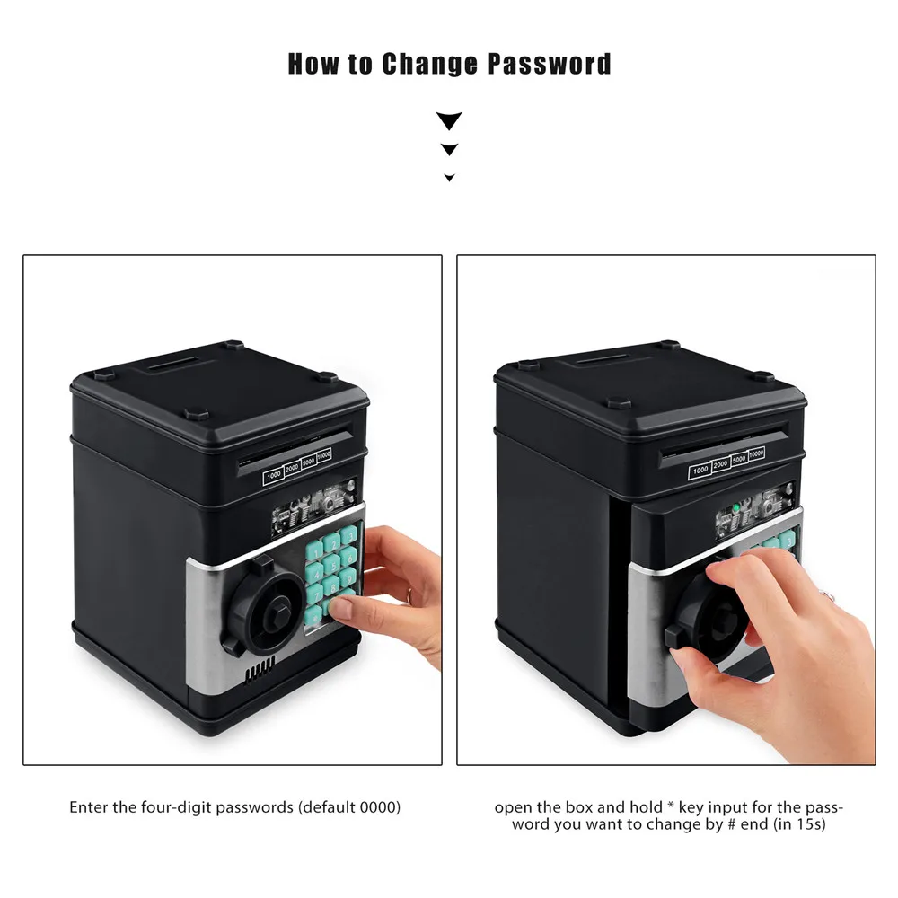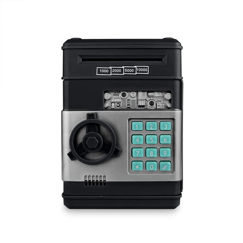 With a password, voice, in addition to saving money, but also to establish savings goals, financial planning. Can be used to store toys, jewellery, bankbooks, etc. The slot in the coin slot can hold COINS or paper money.