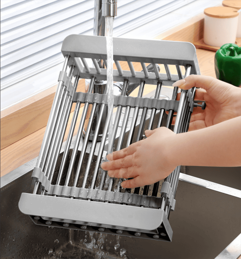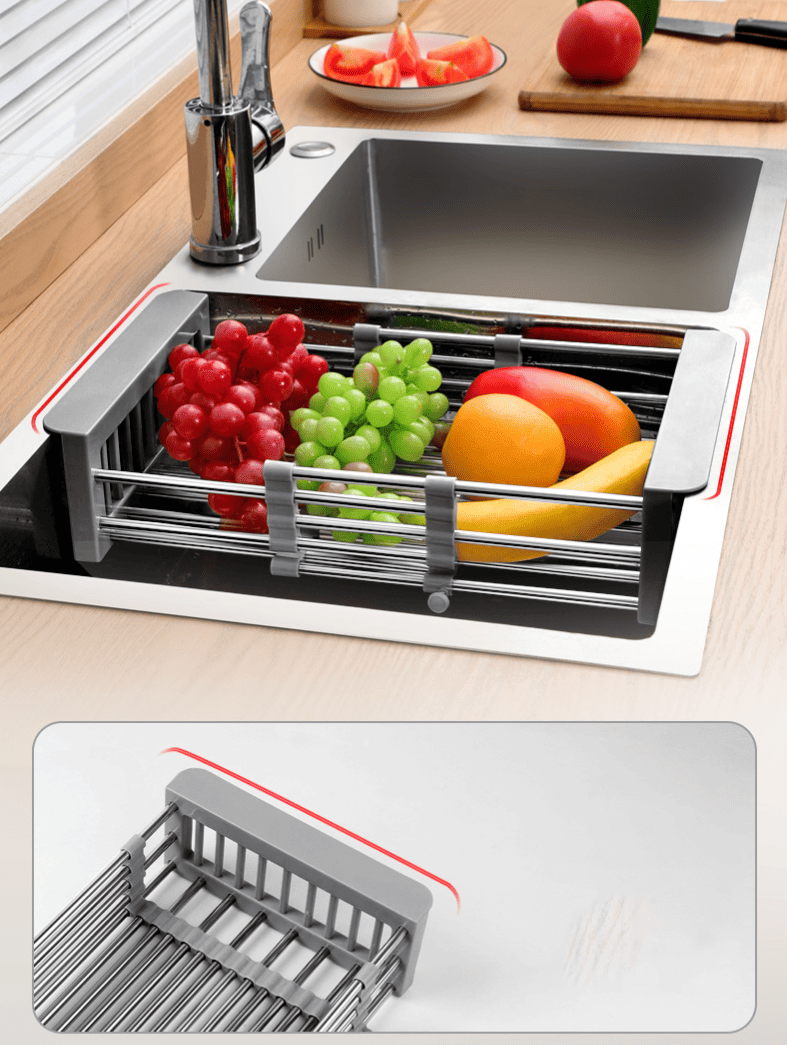 Multifunctional use: The Extendable Sink Drain Strainer Basket can drain dishes or rinse vegetables and fruits. It can contain several cups and dishes at the same time. After cleaning, vegetables and fruits can also be put at the top to drain the water, comfortable to use.