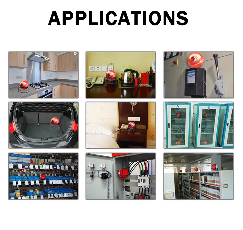 1. Simply throw into the fire, fireplace or installed in fire-prone position, in case of fire, fire extinguisher ball can be carried out automatic with fast response.