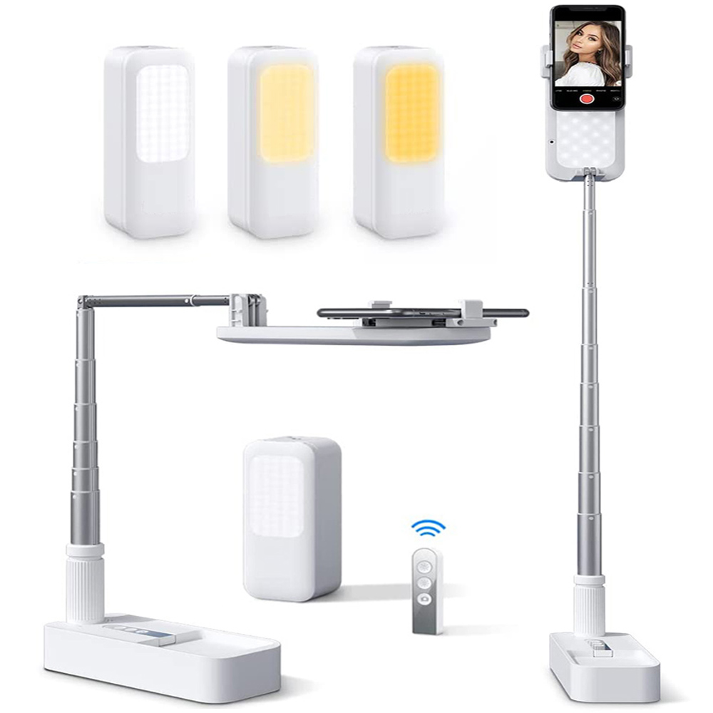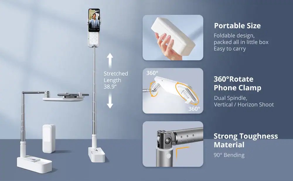 【Easy to Carry】Our standing portable ring light comes with a fully adjustable height and a folding function— from 15.7 inches to 49 inches, 8 grades stretching heights, 360 degree rotatable smartphone holder support portrait mode (vertical) or landscape mode (horizontal). Making it a great option whether you’re setting it atop your desk for video calls or need some overhead lighting and take in your backpack to everywhere when you go out.