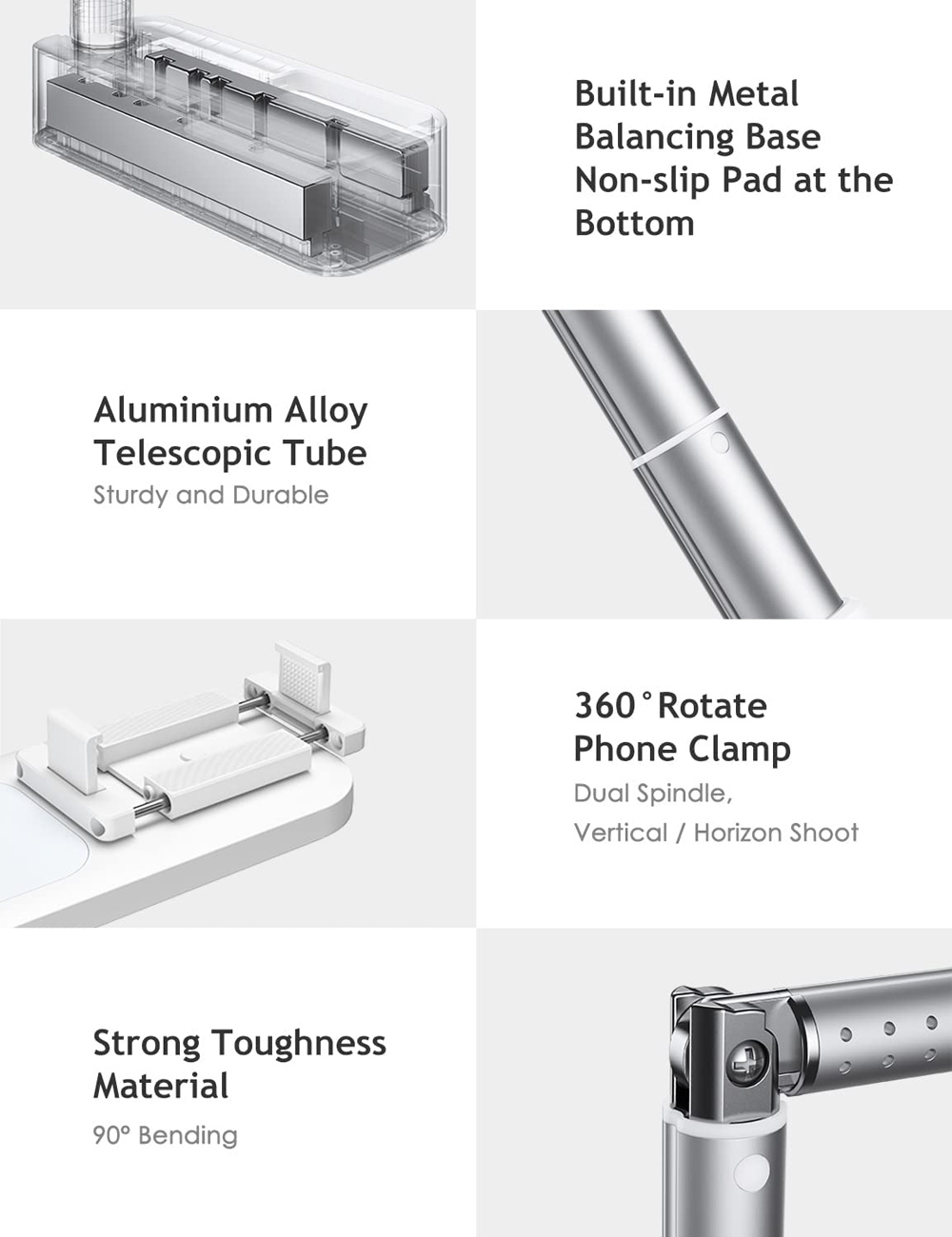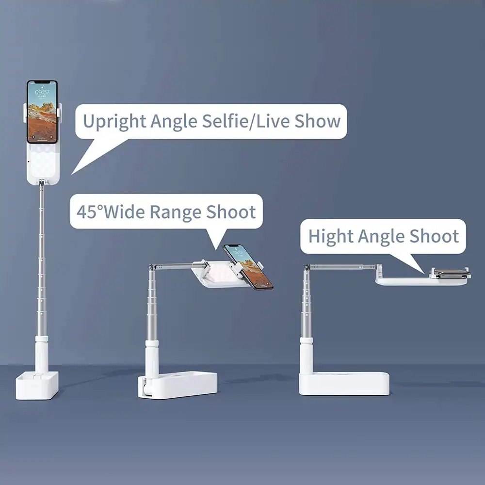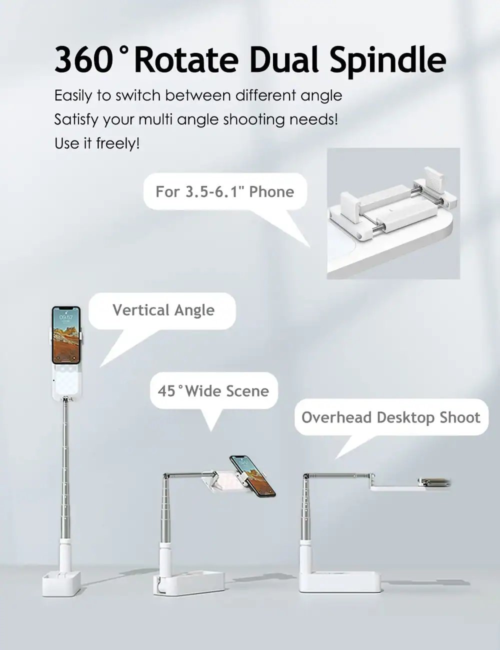 【Rechargeable Ring Light】Our Foldable Phone Stand is equipped with a 1000mAh battery which can work 3-12 hours of long wireless shooting in full charge. Being battery-powered, you can carry and keep it anywhere, and enjoy its bright LED ring light without any restriction. It is great convenience for wireless/outdoor operation.