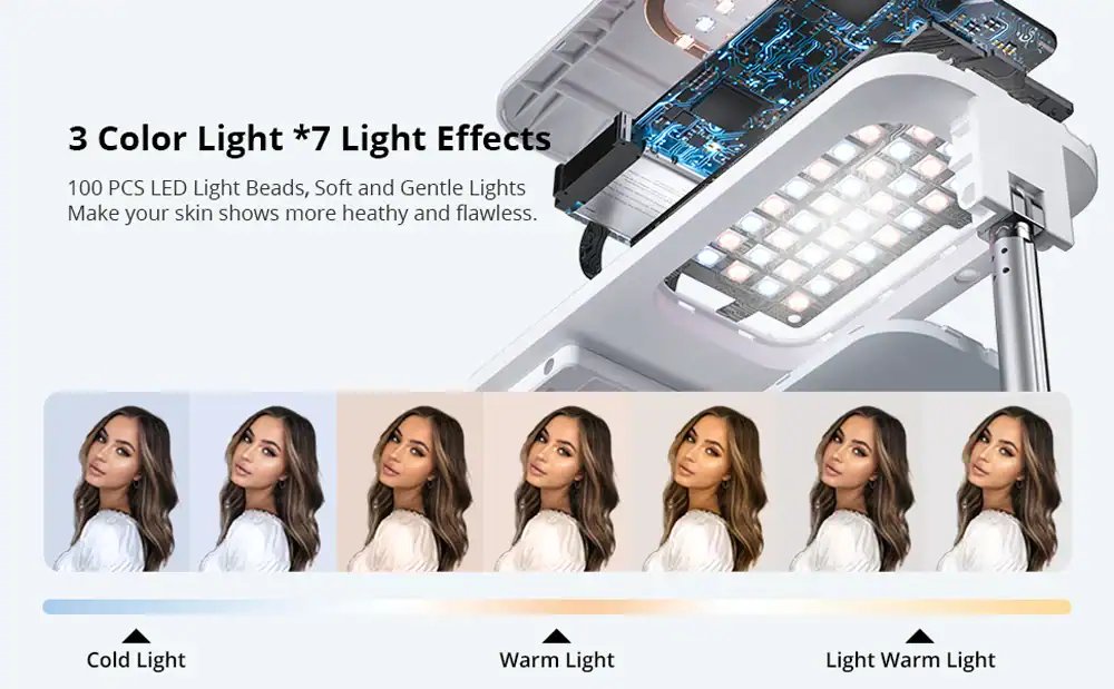 【Dimmable Ring Light】Unique mini box ring light, Featuring 3 color lighting modes: Warm Light (2800-3200K), Cool White (5000-5500K), With 100pieces energy-saving LED beads, delicate light feeling; 7 light modes, warm and cold light effect, three-dimensional fill light, brightness can be adjusted easily by Remote control. Fully show your beauty.
