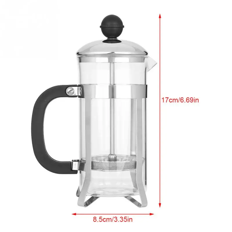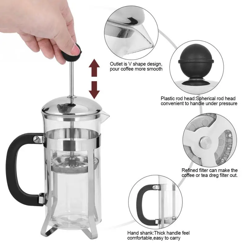 The coffee press pot is a visual scale, controls amount easily. Durable stainless steel material, anti-rust and easy to clean. The refined filter can make the coffee or tea dreg filtered out.