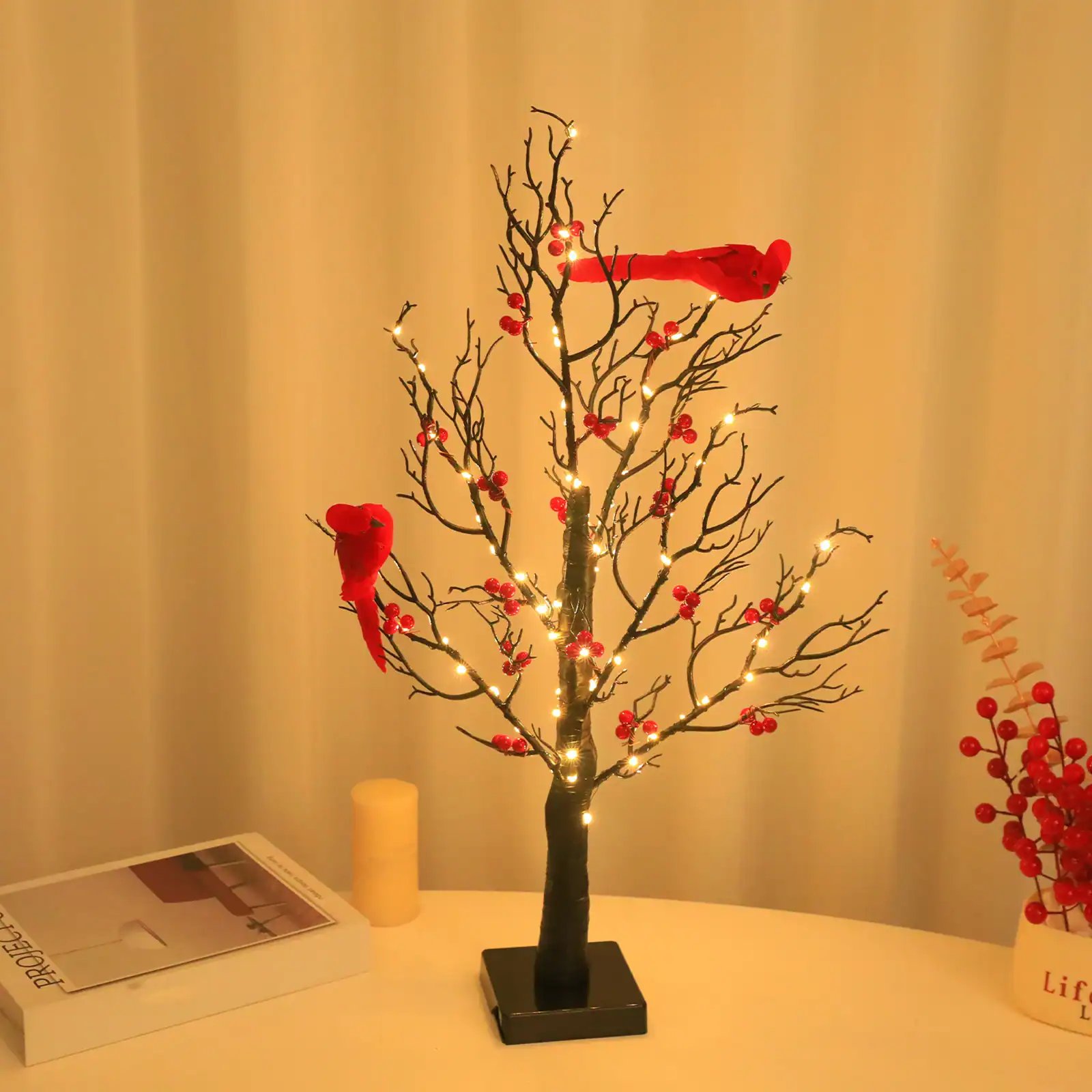 This tree is designed to be a conversation starter and a source of joy. Lifelike cardinals, known as messengers of love and remembrance, are perched among delicate branches adorned with vibrant red berries. When illuminated by the integrated warm LED lights, it creates a magical ambiance that symbolizes hope and comfort.