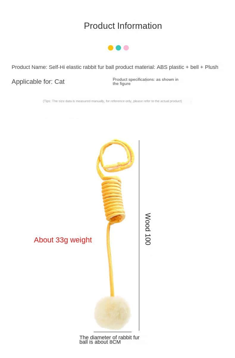 Product Cats ball with elastic and spring is as expected. A great product for a young cat or kitten to play with. Only ceiling or door mounting is necessary to mount a hook yourself. For ceiling fastening you need 2 pieces. I knotted 2 pieces together. My cat loves it.