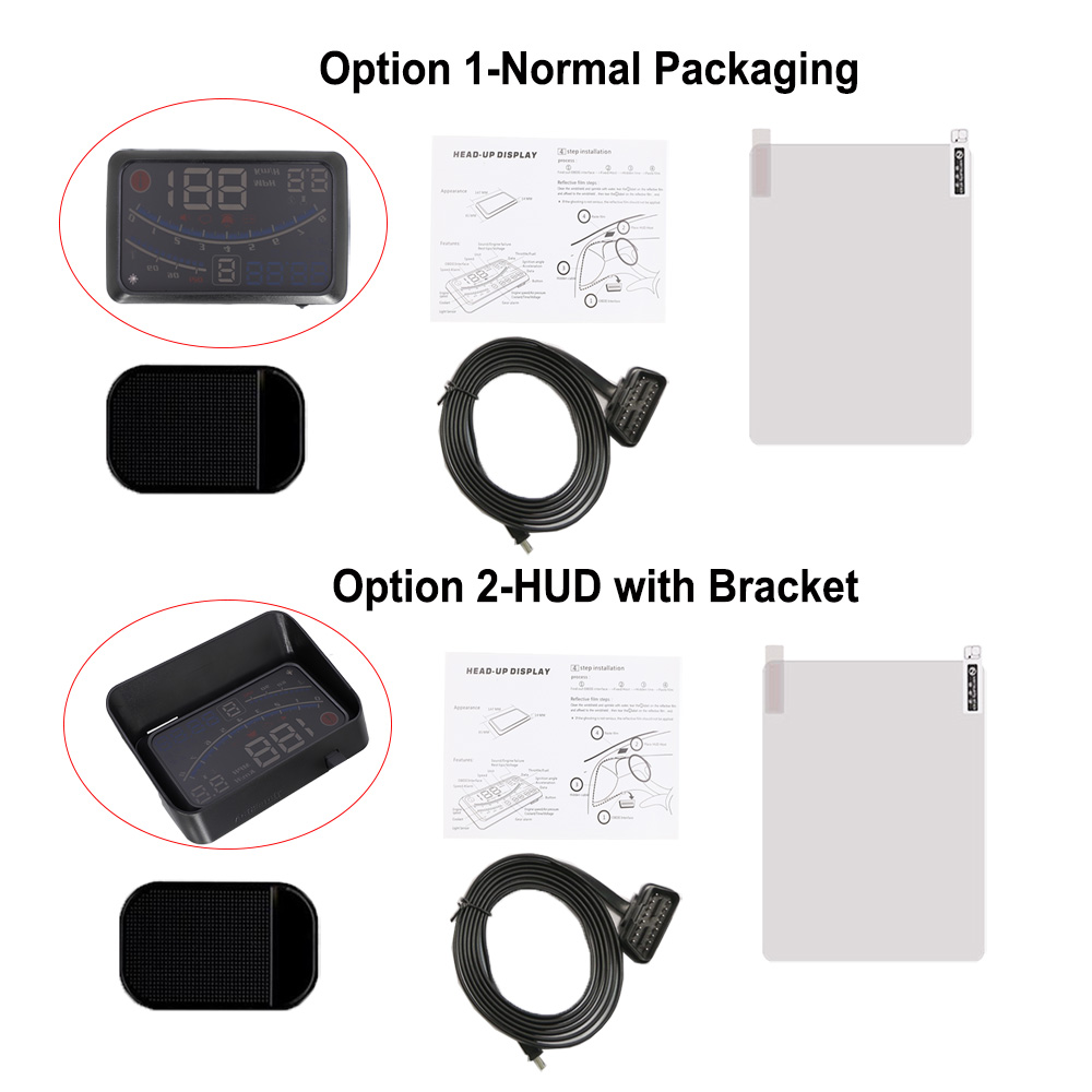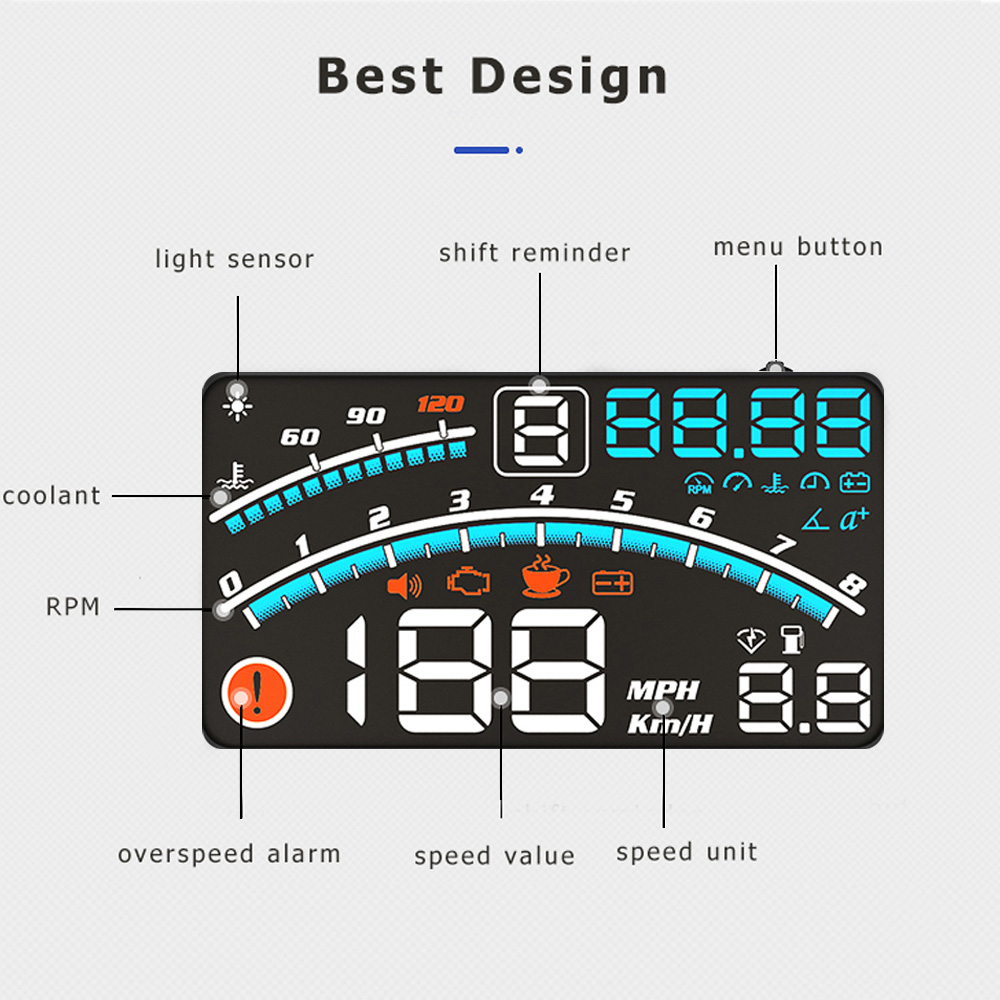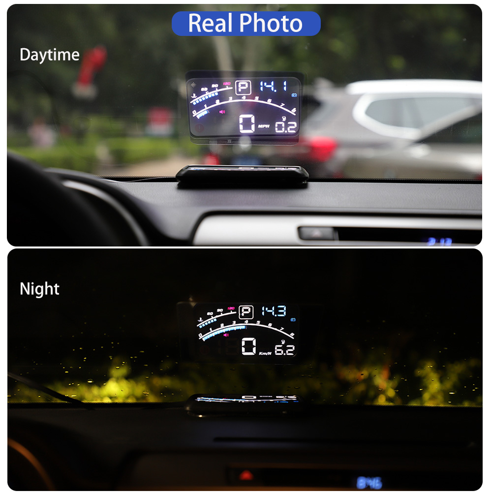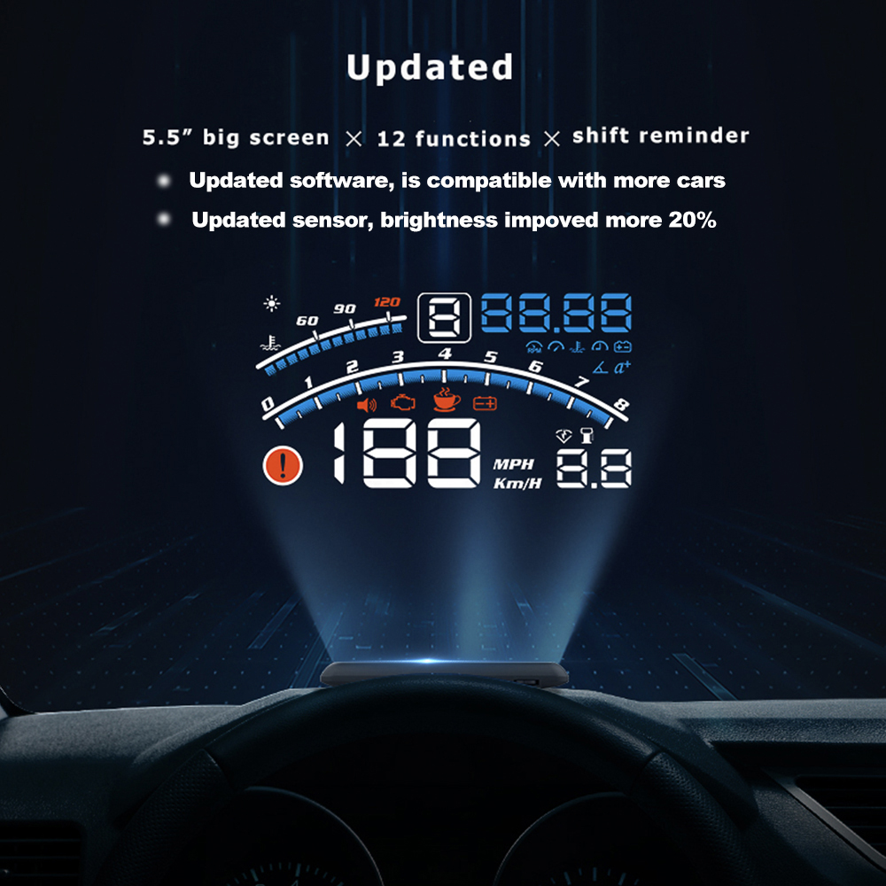 This is a classic OBDII heads up display car with a 5.5” large screen. Displays driving data on the front windshield, such as speed, RPM, water temperature, voltage, single mileage, etc. HUD avoids the danger of drivers looking down at the dashboard; it ensures the safety of drivers because they watch the data on the car’s front window glass and helps drivers to keep the best state on the way, keeping them in a safe driving mode. Besides, a variety of operating interfaces and colors can be switched freely. It will bring more fun to your car life.