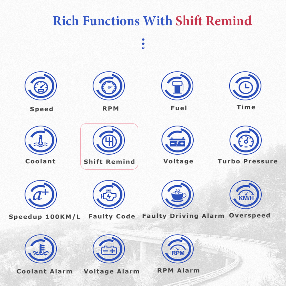 Alarms: overspeed alarm, High water temperature alarm, Low voltage alarm, Shift Reminder, Engine fault alarm, Clear fault code, Free switching between kilometer and miles, KM/h & MPH Switch freely, °C & ℉ switch freely, Fatigue driving reminder…