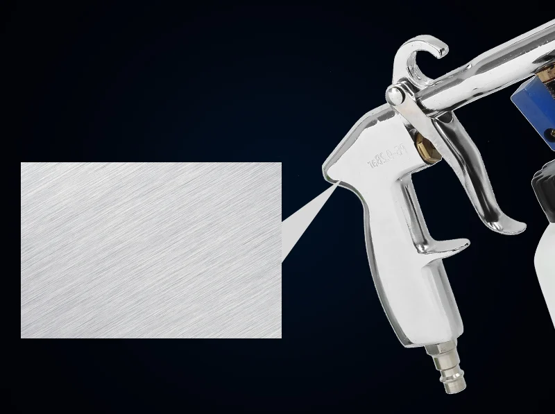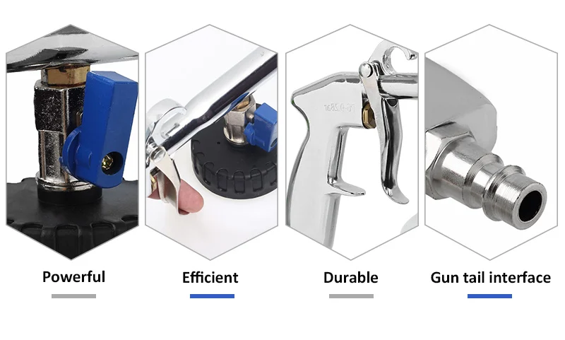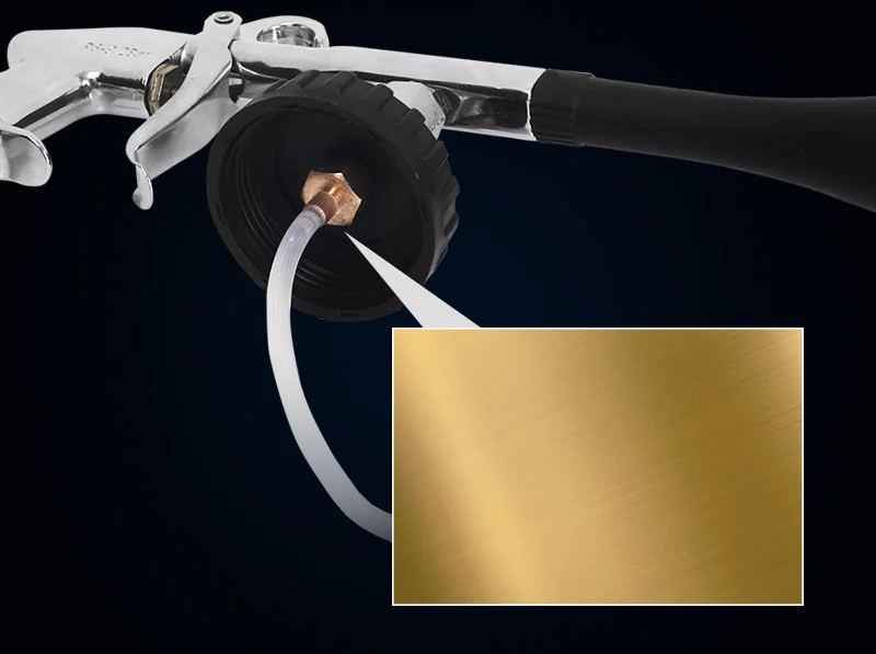 The machine is connected with the air source, which causes high-speed rotation of the circular tube within the bell mouth of the cleaning machine with a pressure of 6.5-9.2kg. The centrifugal force as a result of the rotation evacuates the airs in the centre and forms a powerful airflow to atomize the detergent. The atomized detergent is attached on the stained parts to completely separate the stain molecules from the surface of the parts.
