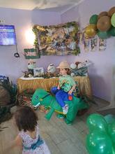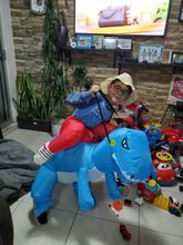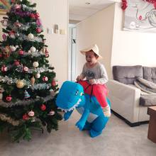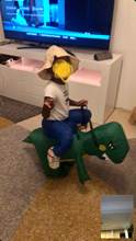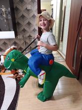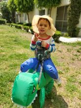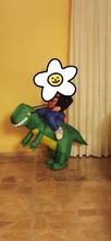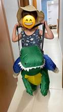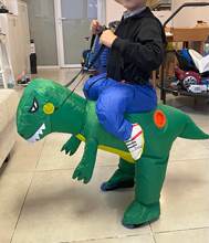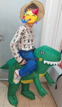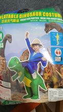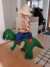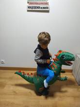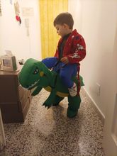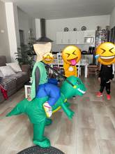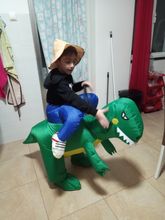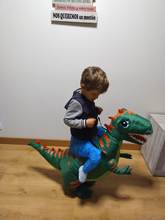 The costume is identical to the photo and arrived super fast, I bought it for my 3-year-old son who is 104 cm, I took the size 98-120 cm and it was perfect. The costume goes to batteries that do not include them, it carries a battery, that when the child wears the costume on you give it and it inflates .. You have to be connected all the time, it is worth it if they like dinosaurs when inflated