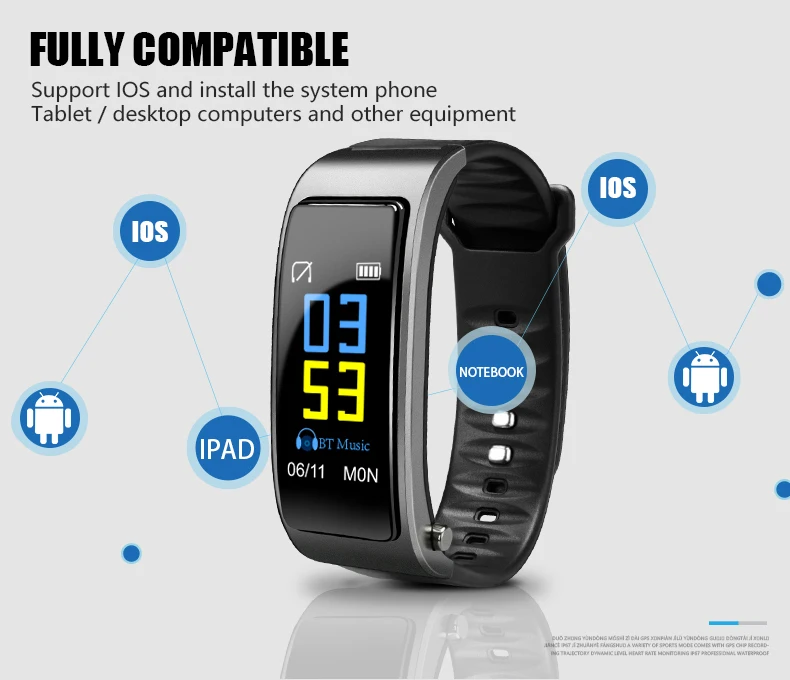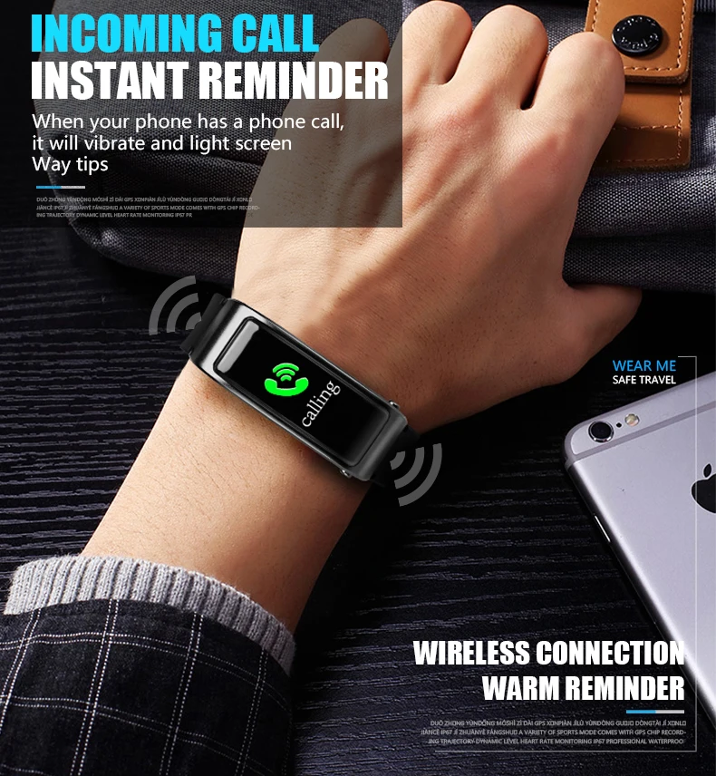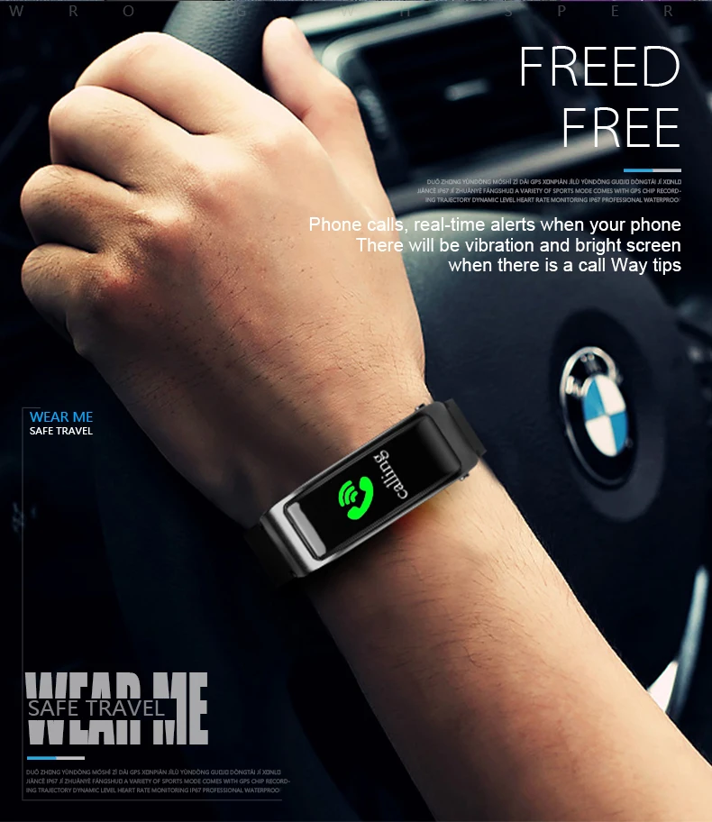 Connect the bracelet and smartphone with Bluetooth. When the bracelet is ringing, simply pick up the Bluetooth earphones. No need to answer the call by smartphone. Increase driving safety or allows you to focus on workouts.