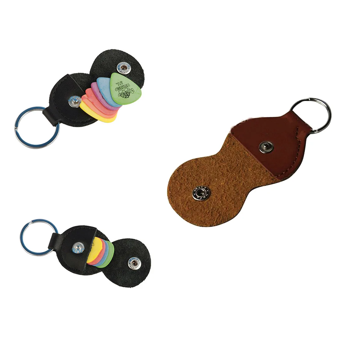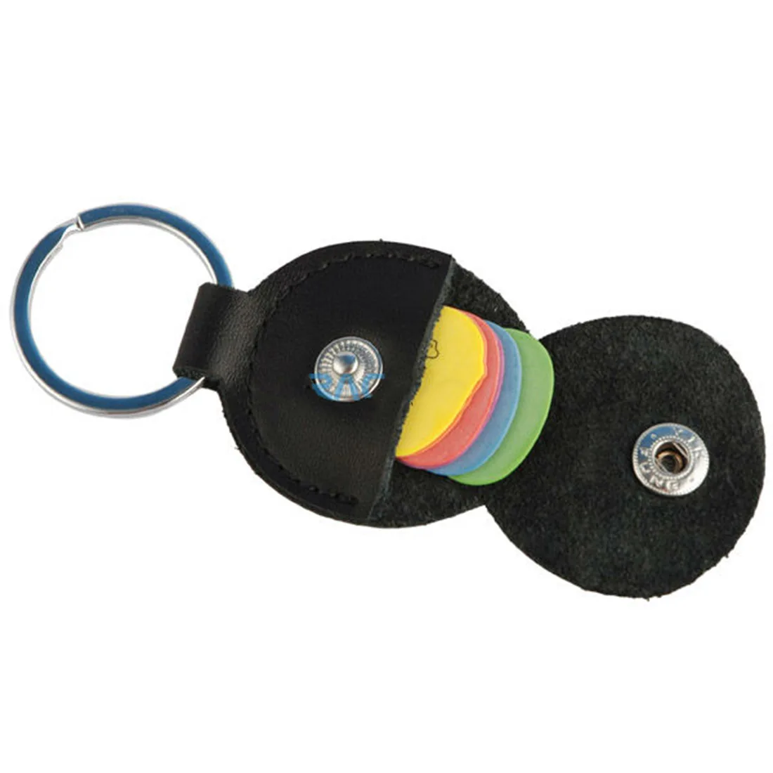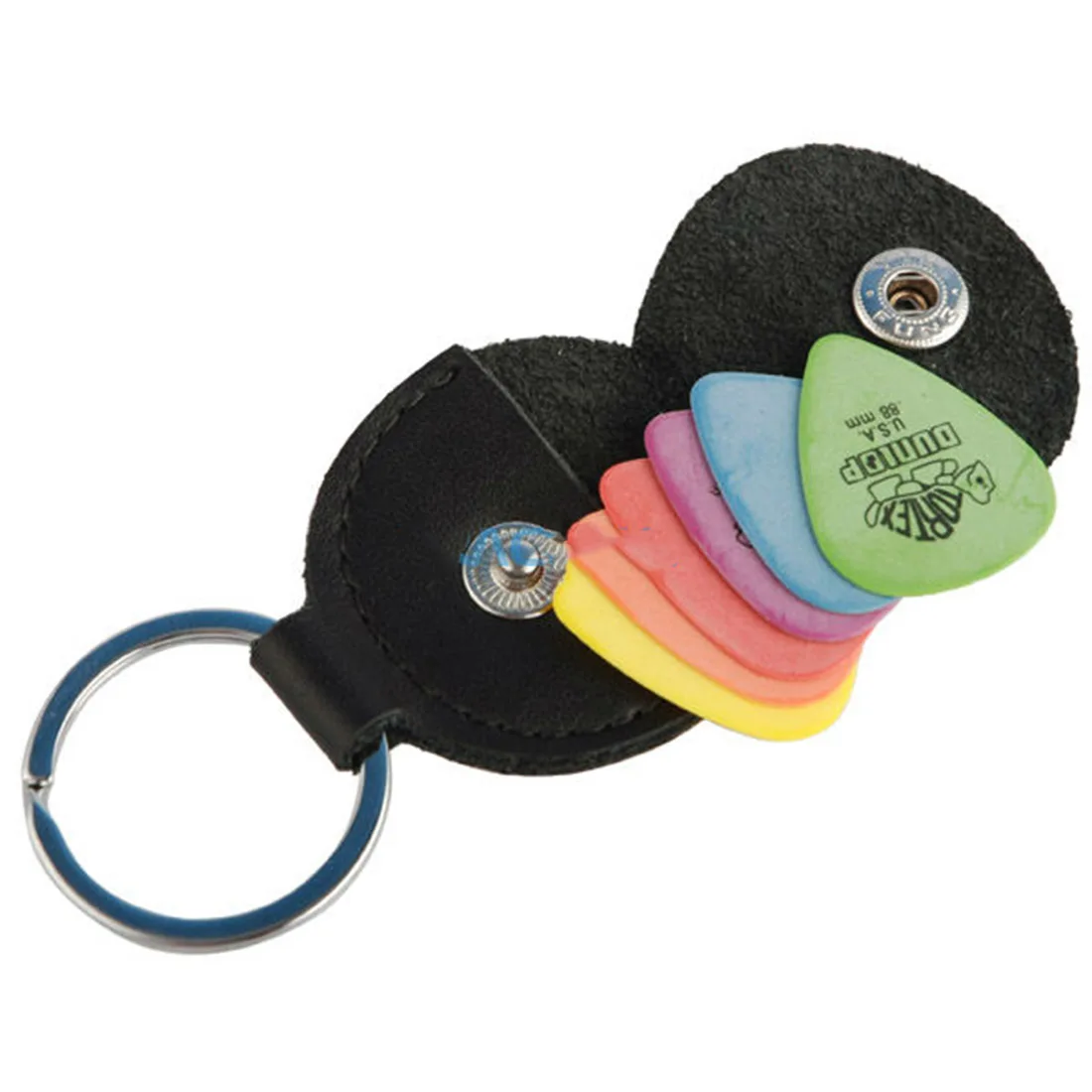This Keyring Pick Holder is revolutionary! It safely holds your guitar picks in an easy to find, easy to access place. Never lose your picks again, with up to 12 picks per holder! Made from genuine black leather.
