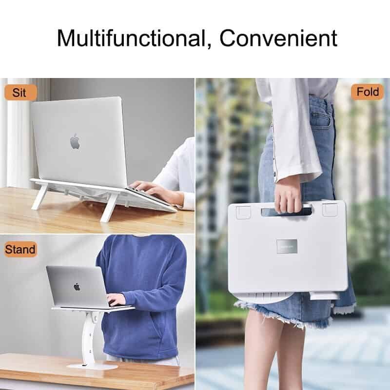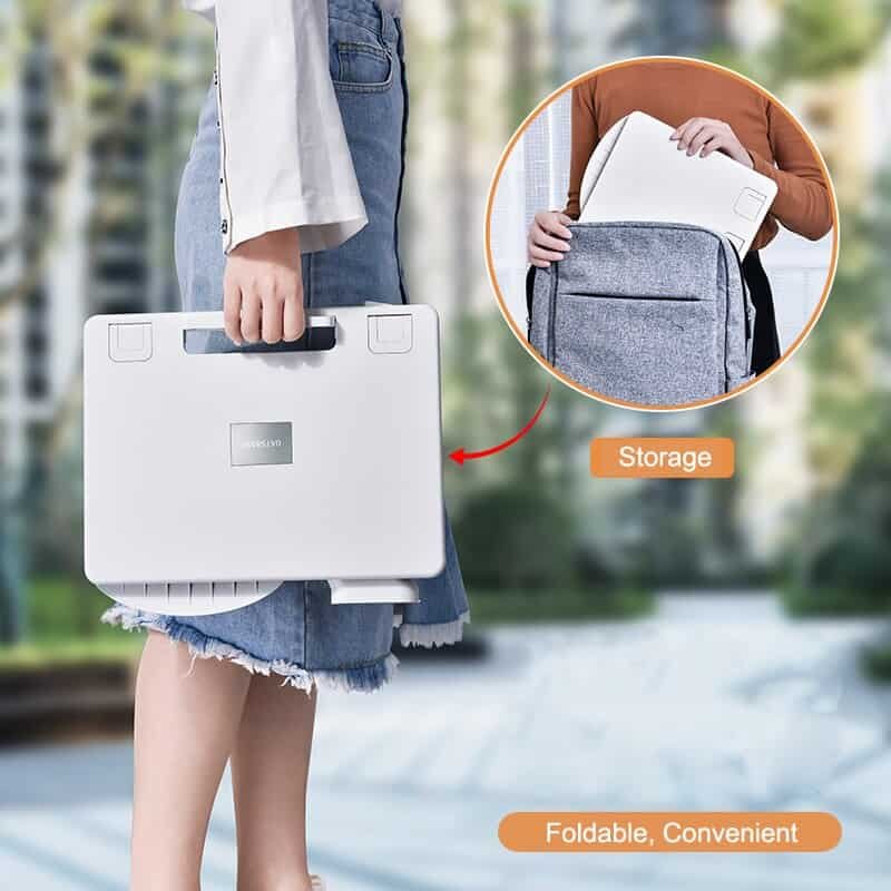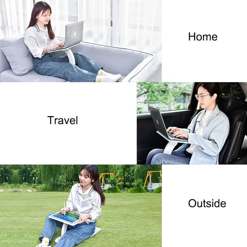 1.【PORTABLE & DETACHABLE】 — Our laptop desk is made of high-composite and ultra-light PC material(1.5 lb), which not only ensures the good quality of the product, but also greatly reduces its own weight. The detachable design makes lap desk for laptop no longer limited to indoor use,and it can also be taken to any venue of your event.