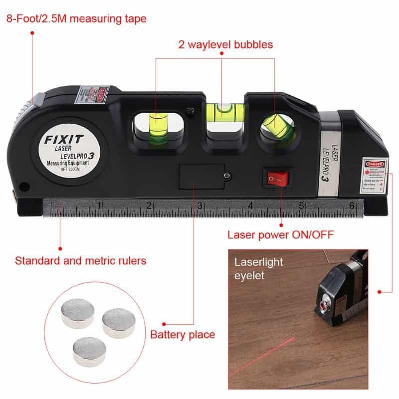 A major improvement featuring the latest multi-pronged measurements technology from other and older versions. Ideal for any job that requires a straight line or accurate measurement. Suitable for hanging pictures, installing and adjusting furniture position, aligning floor tiles and many other carpentry projects.