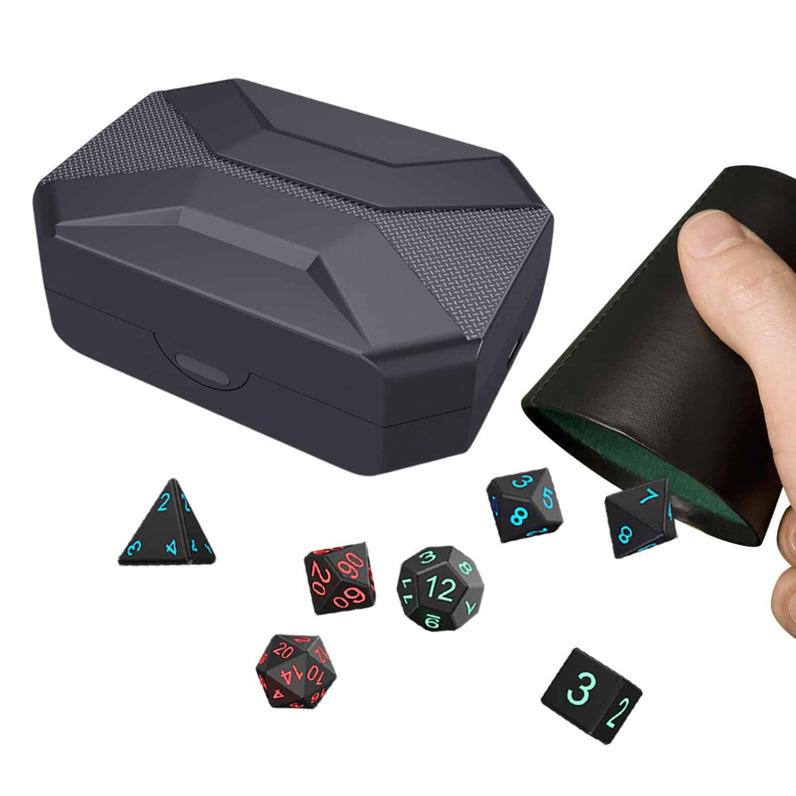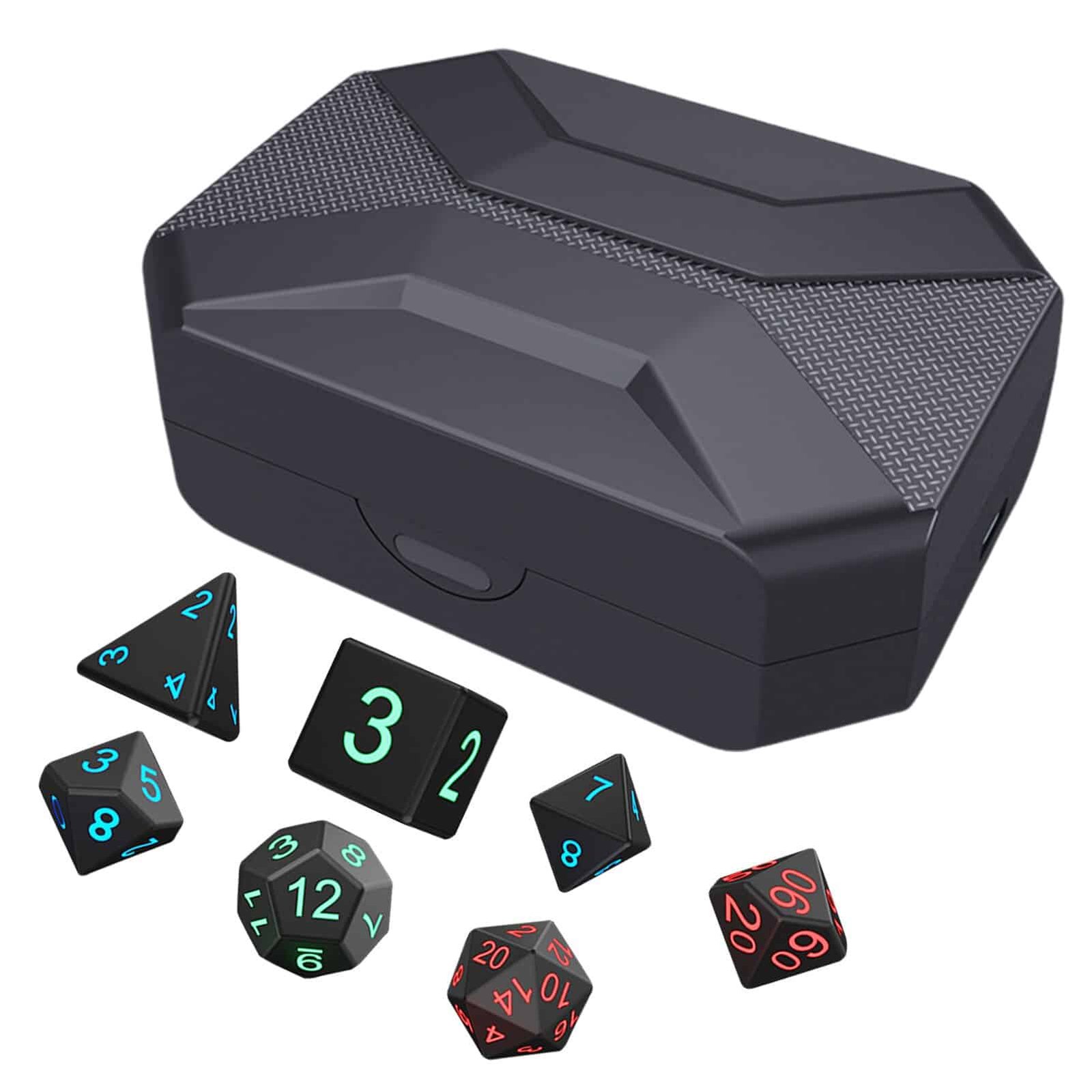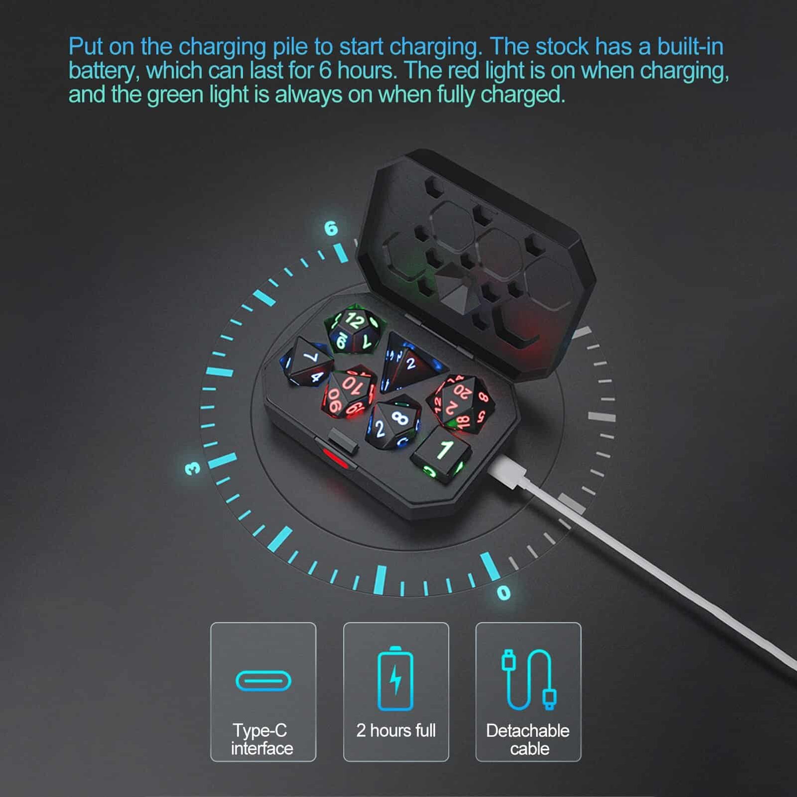 【Exquisite & Unique LED Beads】These DND dice have built-in LED beads that flash 3 colors of light, blue/green/red. USB rechargeable, each glowing dice has a circuit board installed and the charging case allows you to charge the electric dice via power adapter/mobile power/PC.