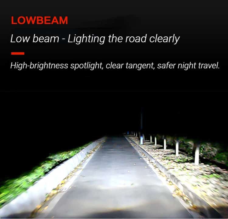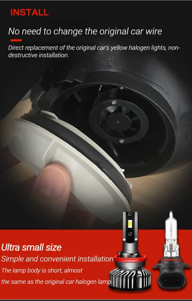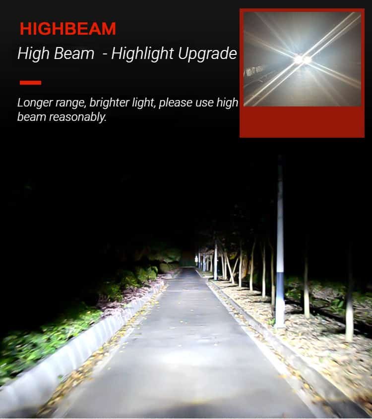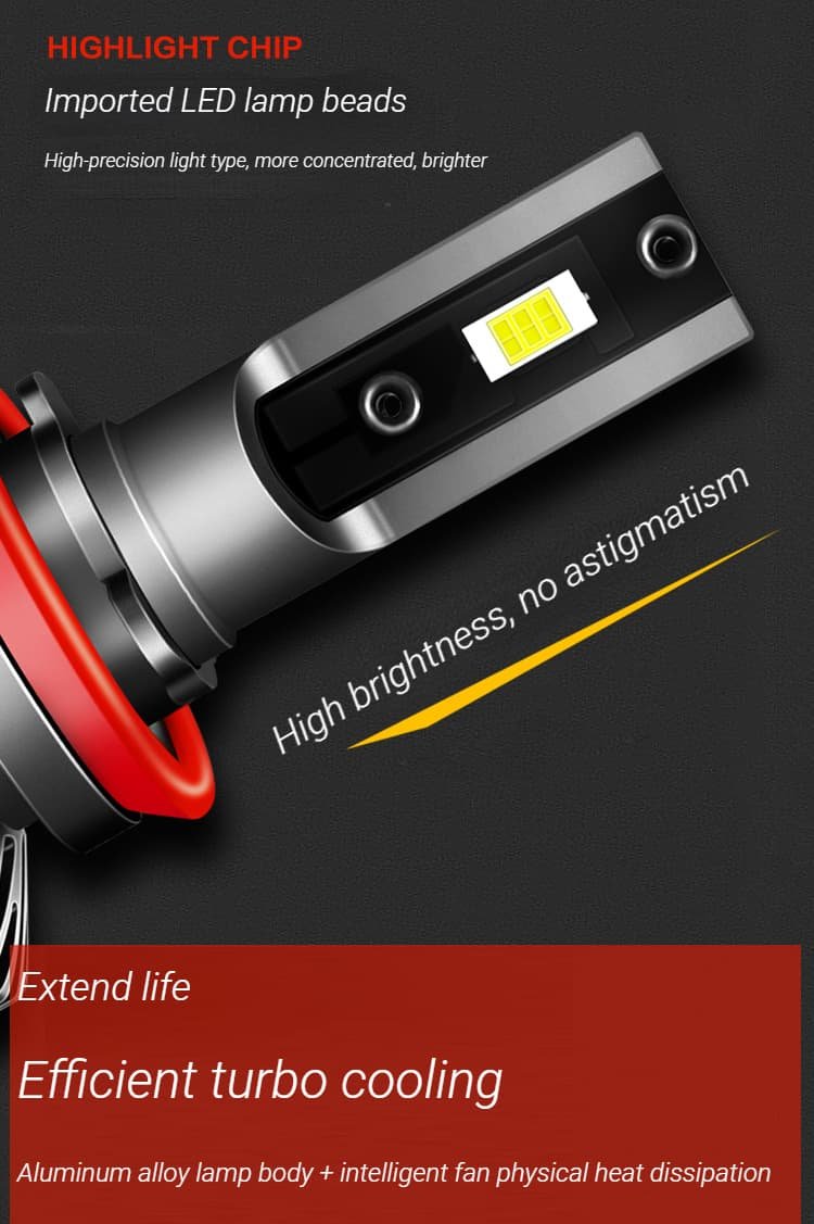 4. Long service life: The aluminum alloy lamp body + 10000 rpm high-speed silent fan is used for dual physical heat dissipation, which effectively reduces the temperature of the lamp body and prolongs the service life of the headlight.