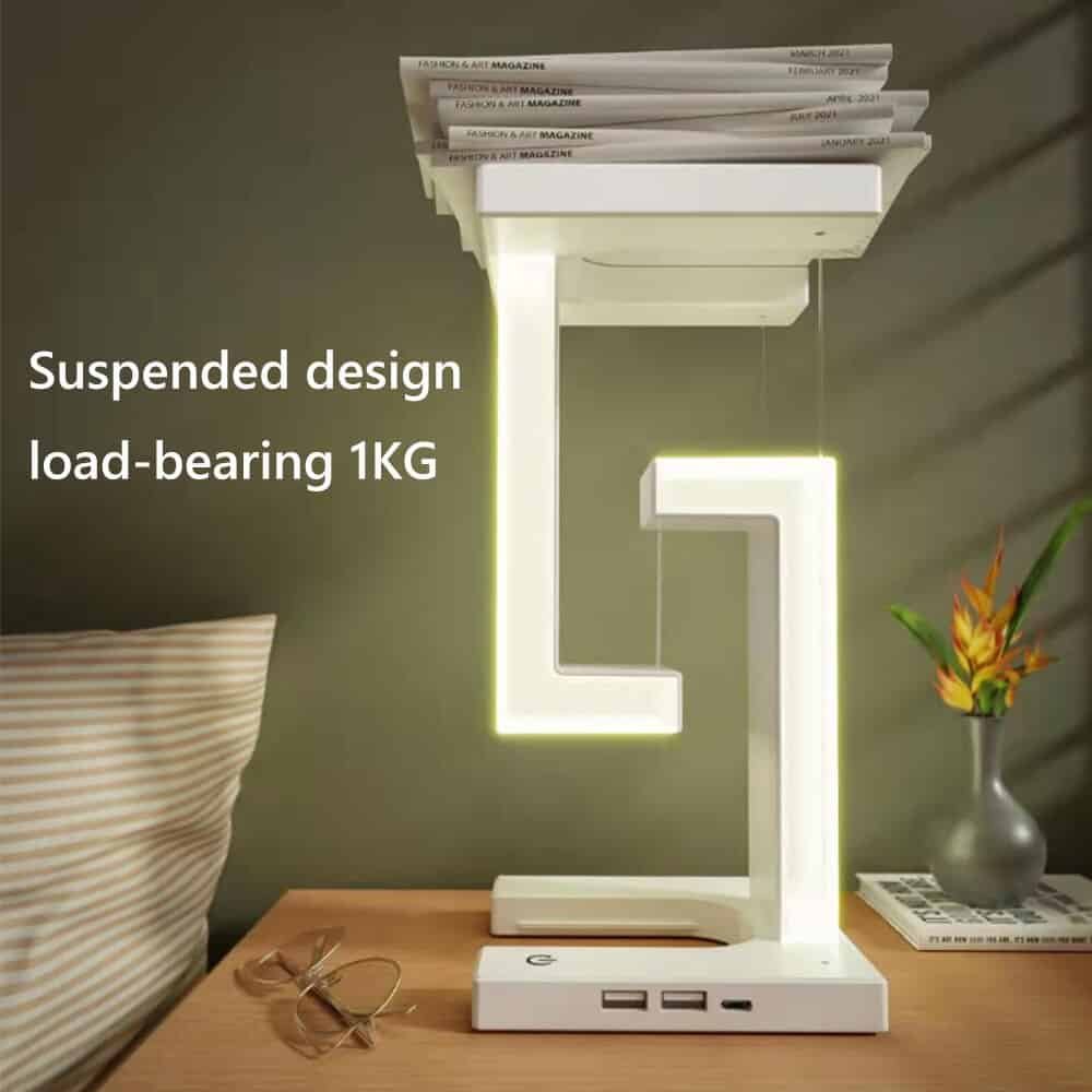 The Levitating Lamp consists of a base and a lampshade that float in mid-air, thanks to the powerful magnetic force. The lampshade can rotate 360 degrees and emit soft and warm light from 84 LED bulbs. You can adjust the brightness of the light by touching the base, which also serves as a wireless charger for your mobile phone. The base supports 10W fast charging and is compatible with 7.5W and 5W devices. The top of the lampshade can also bear up to 1KG items, such as books, plants, or ornaments.