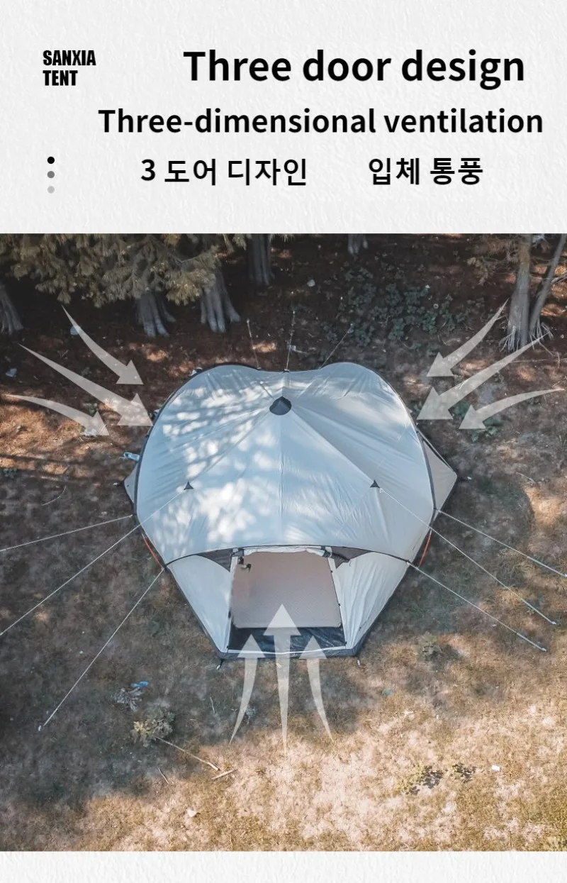It’s not just a tent; it’s a portable haven. The Mongolian Yurt style blends traditional design with modern functionality, offering an unforgettable camping experience. Its three-door system enhances accessibility and ventilation, making it a perfect choice for large groups or families. The additional wind ropes and ground nails ensure stability, even in challenging weather.
