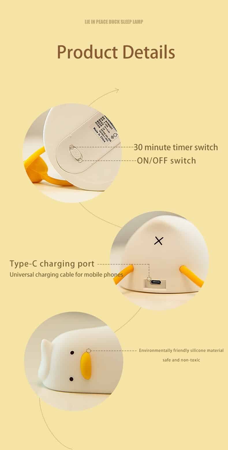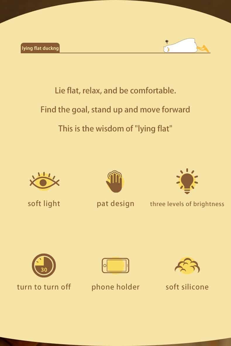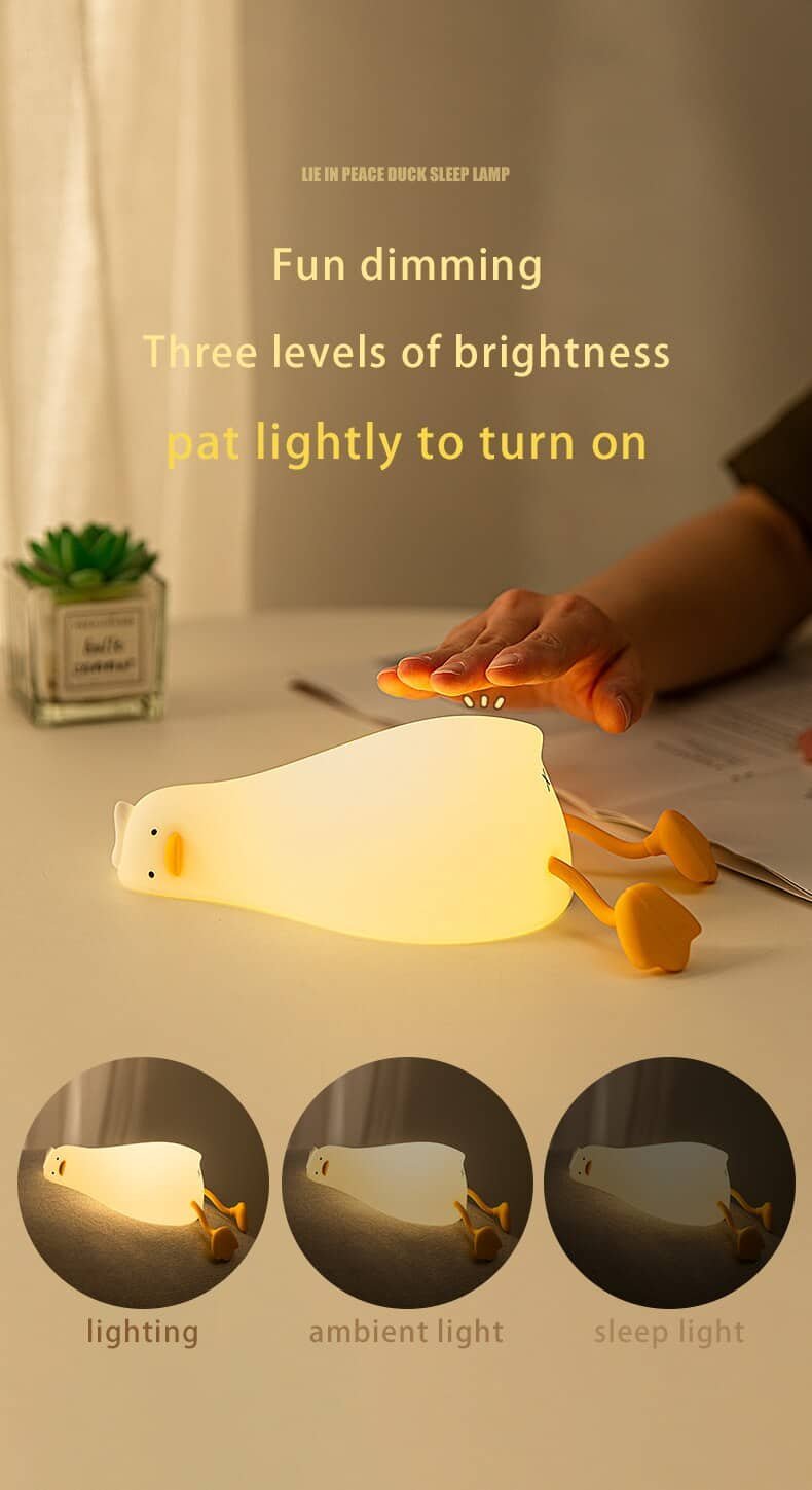 When do you want to go to bed but still want to keep the lights from being too bright for you? Our product Lying Duck Night light will make it easy for you. It is made of high-quality food-grade soft material silicone, water resistance, and drop resistance so that you can knead at will. No matter how you knead it, it can be restored. Moreover, it has anti-blue warm LED lights that won’t flicker or hurt your eyes. And so soft warm light is comfortable and easy to cause drowsiness. Just squeeze or tap it is you can easily turn on it. Finally, the Handheld size and eco-friendly design make it a perfect gift for babies, kids, and adults, and also a nice decoration for your home. Buy it now!