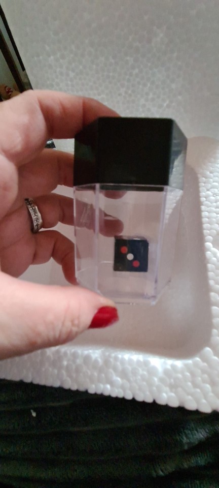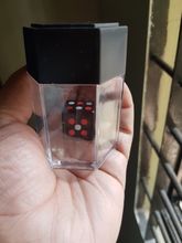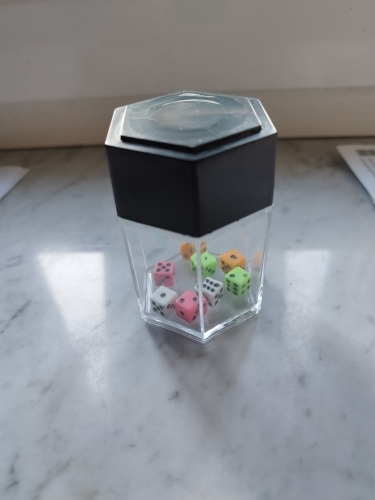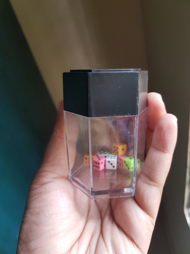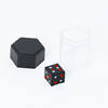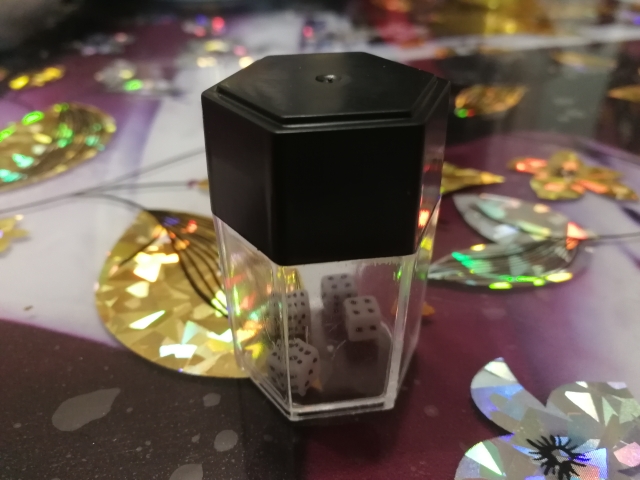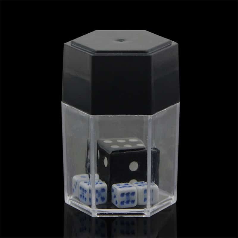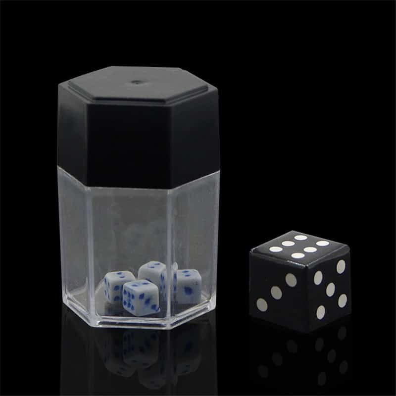 SHAKE THE THE CONTAINER UPWARDS QUICKLY ONCE. THE BIG BLACK DICE WILL BE MAGNETIZED INSIDE THE BLACK LID. MAGIC!